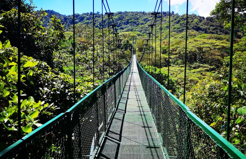 Ein saftiger grüner Regenwald mit hochgewachsenen Farnen, Lianen und vermoosten Bäumen, die in einem leichten Nebeldunst hängen. Zudem kleine rauschende