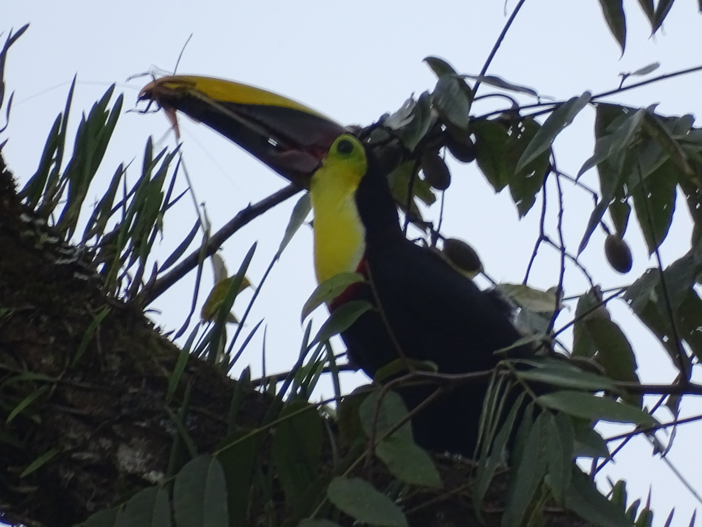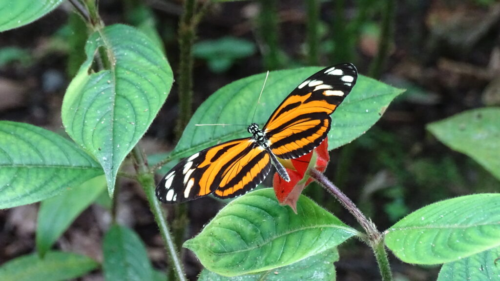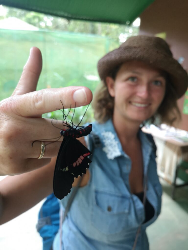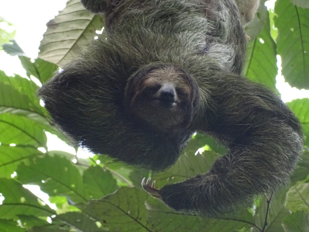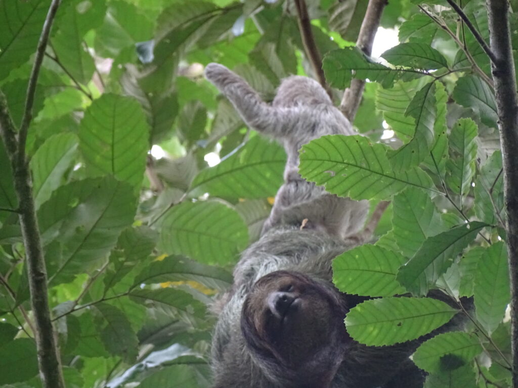 Da sich der Vulkan auch am nächsten Tag nicht mehr Blicken ließ, entschieden wir uns gegen einen Wanderung. Stattdessen wollten wir die Tierwelt Costa Rica weiter entdecken, die es uns in Boca Tapada bereits angetan hatte. So entschieden wir uns das nahegelegene Biotop „Ecocentro Danaus“ zu besuchen. Besonders erstaunlich war, dass dieses ein reiner Sekundärwald ist. Sprich der Wald war zuvor komplett abgeholzt und vor 30 Jahren wurde er erst wieder neu gepflanzt. Es war sehr beeindruckend zu sehen was in dieser Zeit der Natur zurück gegeben werden kann. So ist dies heute mit hochgewachsenen Bäumen das Zuhause von Vögeln, Kolibirs, Brüllaffen, Nasenbären, Kaimanen, Wasserschildkröten und vielen weiteren Tieren. Dort konnten wir unser erstes Faultier in freier Wildbahn sichten und dann auch noch gleich ein Muttertier mit Baby. Glücklicherweise entschieden wir uns bei unserem Besuch dazu, einen Rundgang mit Guide zu nehmen. Das hat sich wirklich gelohnt, denn ansonsten hätten wir bestimmt die meisten Tiere gar nicht gesichtet, da sich diese sehr gut versteckt oder hoch oben in den Bäumen aufhielten. Beim Eintritt ist ausserdem ein Besuch des zugehörigen Schmetterlingsgaren inklusive. Hier tummeln sich zahlreiche bunte Schmetterlinge. Ein besonderes Highlight war, dass Ronja einen frisch geschlüpft Schmetterling in den Garten tragen durfte.