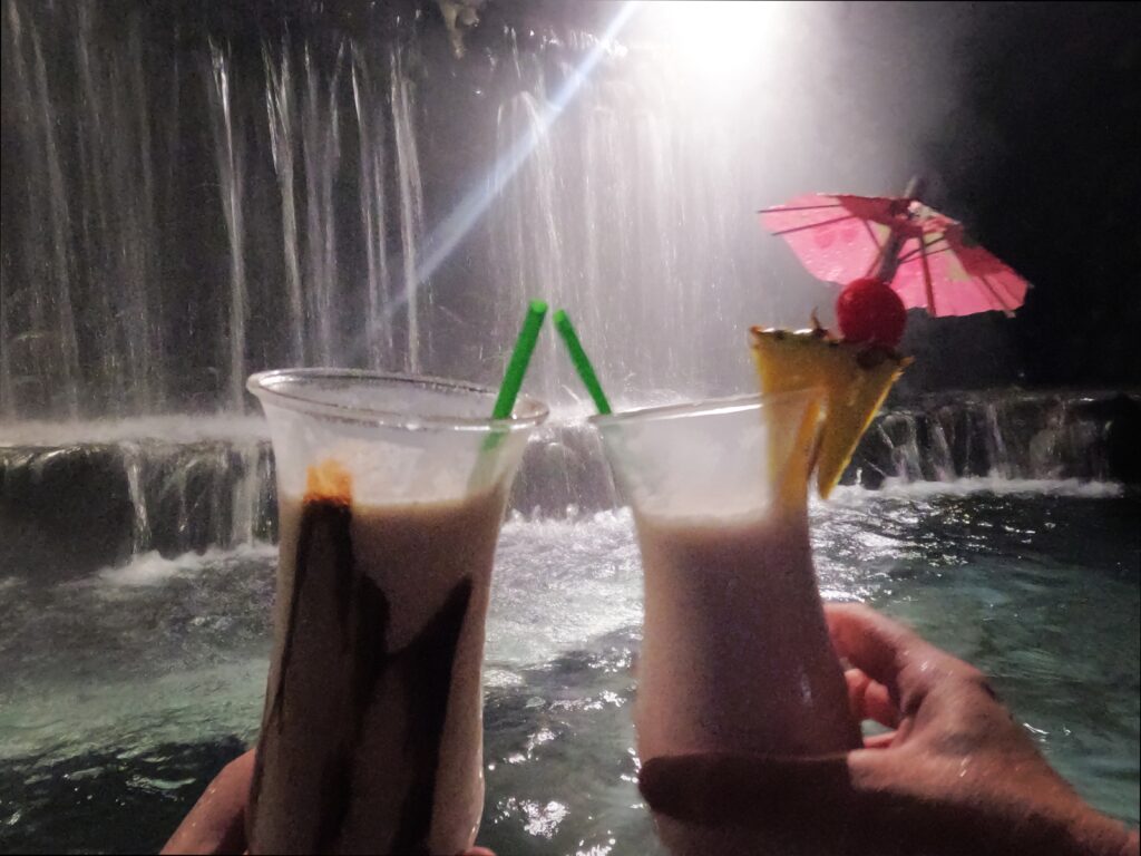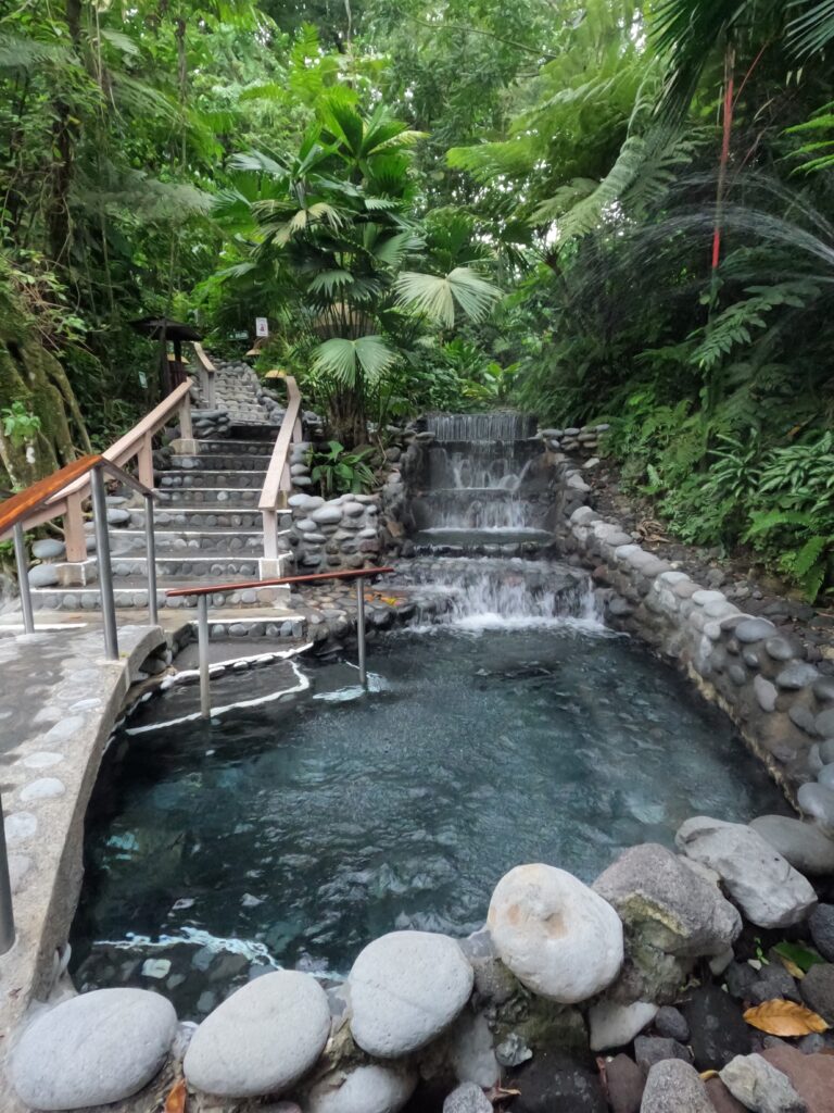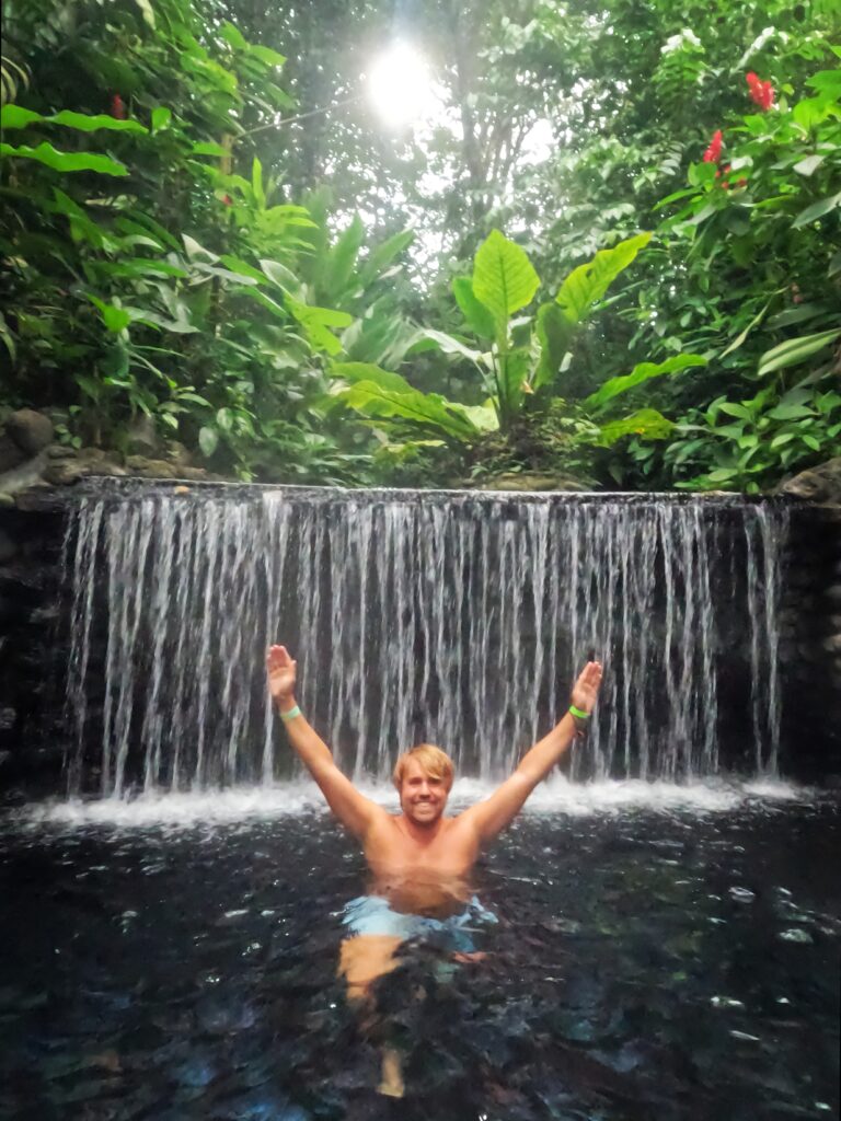 Von Boca Topada aus führte unser nächstes Reiseziel in die Vulkanregion bei La Fortuna. Bereits auf der Anfahrt konnten wir von Weitem den Vulkan sehen, der sich bilderbuchmäßig mit einem zum Kraterrand spitz zulaufendem Kegel von seiner besten Seite präsentierte. Als wir im „Los Lagos Hotel“ angekommen und eingecheckt waren, haben wir erfahren, dass dieses ein kleines Stückchen weiter bergaufwärst sogar einen Aussichtspunkt für den Vulkan besitzt. Doch leider hatte sich das Wetter schlagartig geändert und der Vulkan hatte sich in dichte Wolken gehüllt. Das sollte sich auch in den beiden darauffolgenden Tagen nicht ändern, weshalb wir an dieser Stelle leider kein Bild des Vulkans „Arenal“ für euch haben. Am Nachmittag haben wir uns dann den „Hot Springs“ gewidmet, also den heißen Vulkanquellen, eine der Hauptattraktion von La Fortuna. Hier gibt es zahlreiche heiße Quellen und Thermalresorts, die einem zum verweilen im vulkanisch erhitztem Wasser einladen. Wir entschieden uns für die „Eco Termals Hot Springs“, die mit einer Besucherobergrenze von 150 Personen ein besonders erholsamen Aufenthalt versprechen. Es werden zwei Schichten für einen Besuch angeboten, weshalb es sich empfiehlt hier rechtzeitig online zu buchen. Wir hatten uns für einen Aufenthalt in der zweiten Schicht von 17-22 Uhr entschieden. Die Anlage strahlt wirklich einen sehr entspannte und abgelegene Atmosphäre mitten in der Natur aus. Hier konnte man so richtig abschalten und die Zeit vergessen. Es gibt mehre Becken in unterschiedlichen Temperaturen mit bis zu 40 Grad. Gegen Aufpreis kann man dort auch noch etwas essen oder sich einen der leckeren Cocktails schmecken lassen. Es ist einfach ein herrliches Gefühl in einer lauwarmem Sommernacht einen eiskalten Cocktail zu schlürfen und anschließend noch mal unter einen 40 Grad warmen Wasserfall zu springen. Entspannung pur!