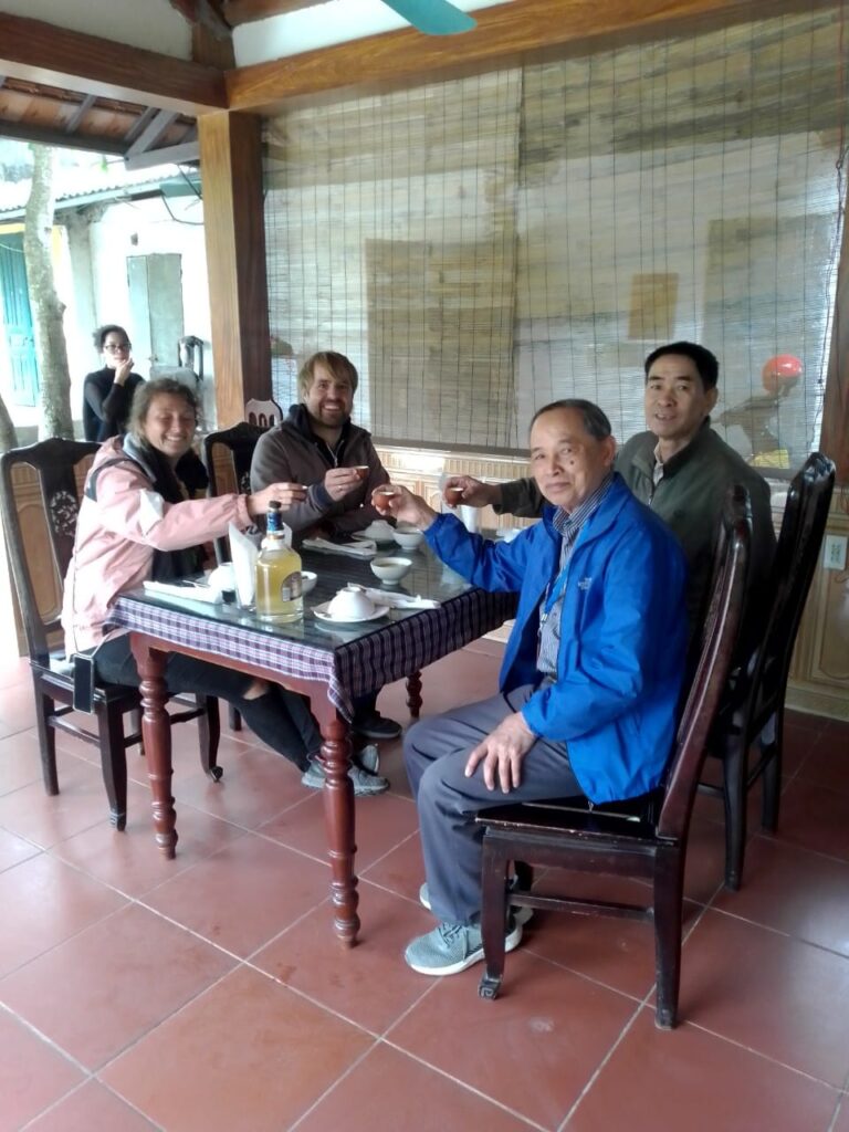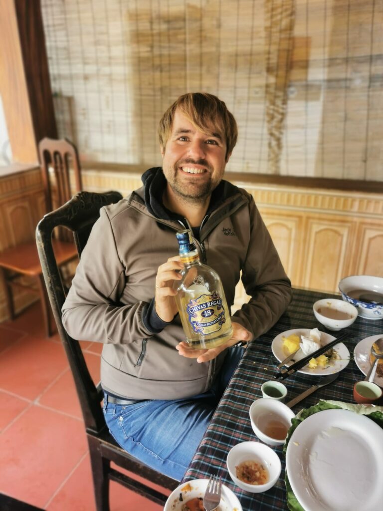 Nach dem Ausflug mit dem Ruderboot waren wir noch in einem Homestay zum Mittagessen eingeladen. Ein Homestay ist eine Unterkunft, die von einer einheimischen Familie geleitet wird. Hier waren wir zusammen mit unserem Reiseleiter und Fahrer zum Mittagessen eingeladen. Zunächst haben wir unseren Gastgeber und Koch kennen gelernt. Wie es sich hier gehört, wurde erst einmal eine Runde Reisschnaps getrunken und „Auf die Gesundheit“ angestoßen und anschließend gegenseitig die Hände geschüttelt. Kurz darauf haben wir noch den Vater unseres Gastgebers kennen gelernt und es wurde ein zweites Mal angestoßen. Allerdings diesmal ohne unseren Fahrer, da dieser ja fahrtauglich bleiben sollte und ohne Ronja, da sie am Tag zuvor eine kleine Magenverstimmung hatte und somit nicht allzuviel von dem Schnaps kosten wollte. Anschließend wurde das traditionell zubereitet Mittagessen serviert. Zunächst gab es eine Kürbissuppe. Während der Suppe wurden noch weitere Male auf die Gesundheit angestoßen und weitere Trinksprüche wie „trăm phần trăm“ eingeführt. Wörtlich übersetzt bedeutet das so viel wie „100 Prozent“ oder bei uns eben sinngemäß „auf Ex“. Allerdings zählten jetzt nur noch unser Reiseleiter Tri und ich zu den trinkenden. Weitere ging es mit vietnamesischen Frühlingsrollen. Auch während diese verspeist wurden, durfte zwischendurch natürlich nicht vergessen immer mal wieder auf die Gesundheit anzustoßen. Es folgten unzählige weitere Platten und Teller die unser Gastgeber nach und Nach auf den Tisch stellte. Hinzu kamen gebratene Schweinespieße, geschmortes Schweinefleisch, Mango-Ananas-Schweinebauch, Sojasprossen, das Grüngewächs von der Süßkartoffel (spinat-ähnlich zubereitet) sowie Reis und eine Fruchtplatte als Nachtisch. Das Essen war unglaublich lecker und Ronja meinte, sie hätte mich noch nie so viel essen sehen. Vielleicht lag es auch an dem appetitanregenden Reisschnaps, denn zwischendurch ging es die ganze Zeit mit „trăm phần trăm“ und „auf die Gesundheit“ weiter. So hatten Tri und ich am Ende des Essen beinahe zu Zweit eine halbe Flasche des 40-prozentigen Reisschnaps intus. Sobald Ronja’s Teller leer war, wurde auch dieser immer wieder von unserem Gastgeber aufgefüllt und sie hatte derweile heimlich angefangen die beiden süßen Hunde der Gastfamilie unter dem Tisch zu füttern. Im Nachgang bekam ich sogar eine Beschwerde von ihr, dass ich den armen Hunden das ganze Essen weggefuttert hätte. Nach dem Mittagessen ging es für uns weiter in Richtung des Flughafens von Hanoi, da wir am späten Nachmittag noch nach Hue in Zentralvietnam weiterreisten. Auf dem Weg zum Flughafen hatte ich die ganze Fahrt tief und fest geschlafen. Dort angekommen, verabschiedeten wir uns von unseren beiden Reisebegleitern und bedankten uns für die tolle gemeinsame Zeit in Nordvietnam, ehe wir in unseren Flieger nach Hue einstiegen und weiterreisten.
