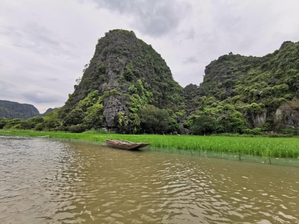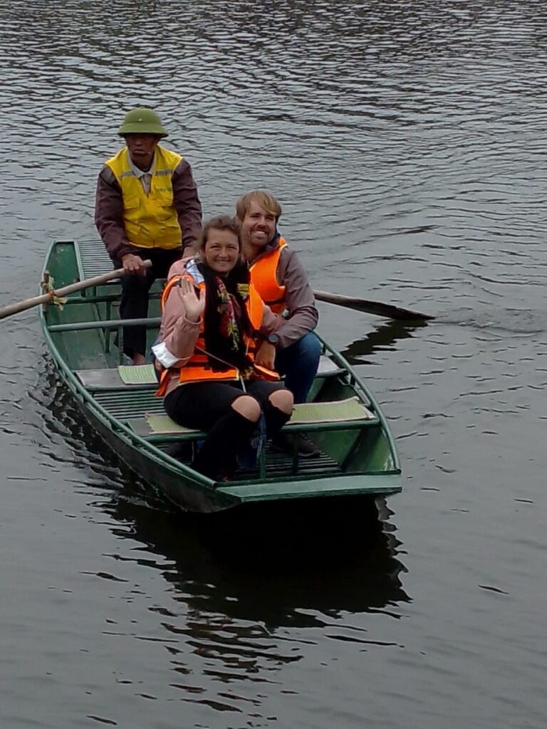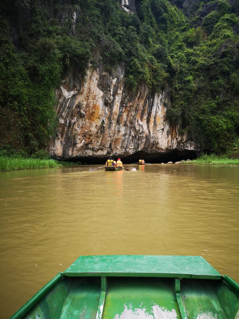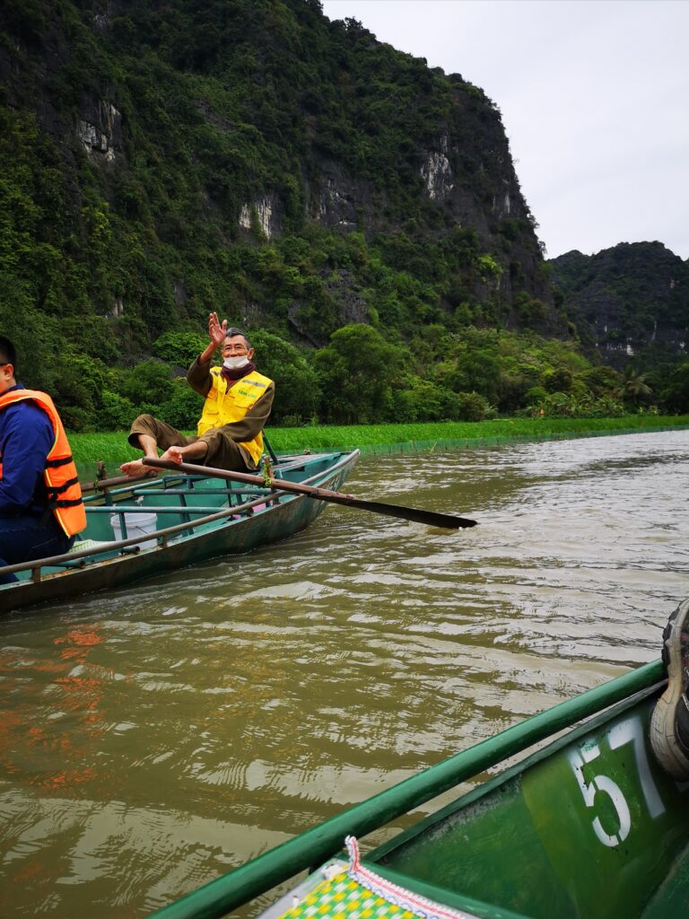 Am nächsten Tag ging es für uns mit einem Ruderboot weiter, um die „Tam Cốc“ (deutsch: Drei Höhlen) zu besichtigen. Hier wird man von einem Bootsführer entlang malerischer Landschaften geführt, umhüllt von Reisfeldern und Kalksteinfelsen. Unterwegs passiert man mit dem Boot drei Kalksteinhöhlen. Die Bootsführer haben hier zum Rudern eine ganze eigene Technik entwickelt. Es wird nämlich nur am Anfang ein kurzes Stück von Anlegestelle mit den Händen gerudert und anschließend mit den Füßen weitergemacht. Den ganzen Ruderablauf zu koordinieren und das Boot so durch die Flussarme zu manövrieren stellen wir uns nicht gerade einfach vor. Dies hatte bei den Bootsführern jedoch erstaunlich gut funktioniert.