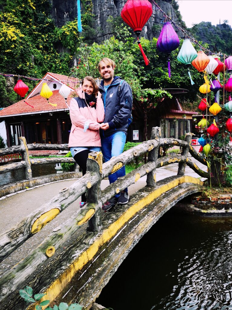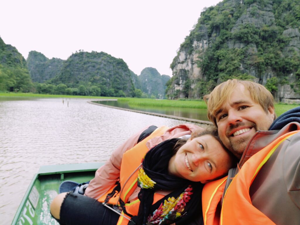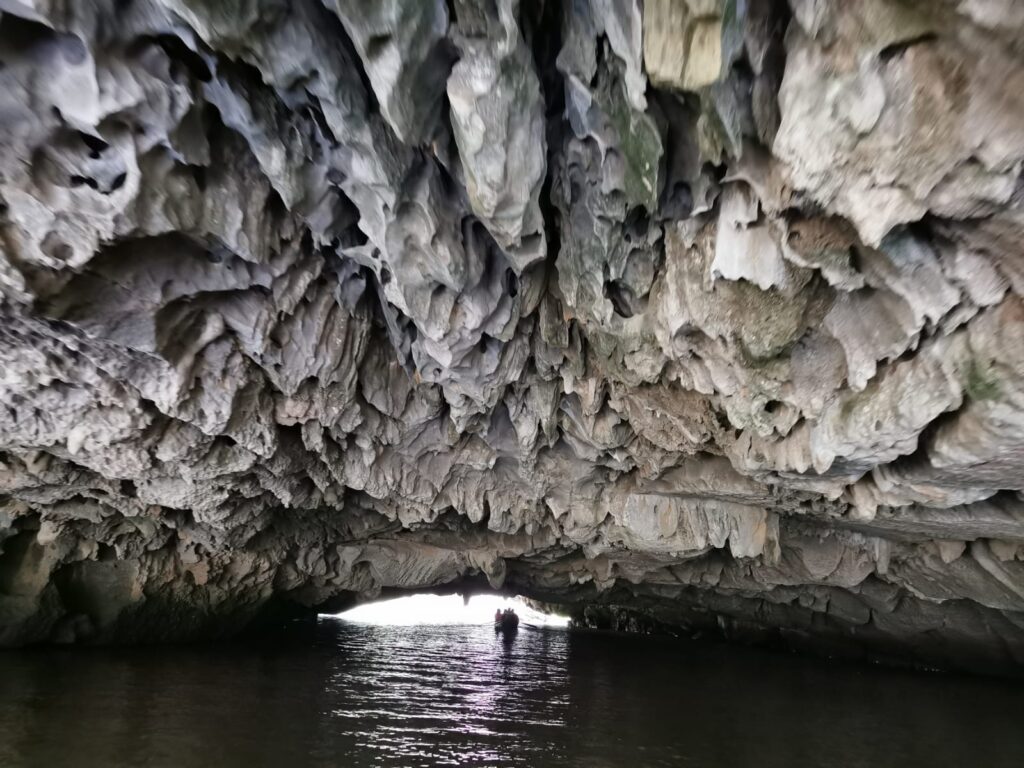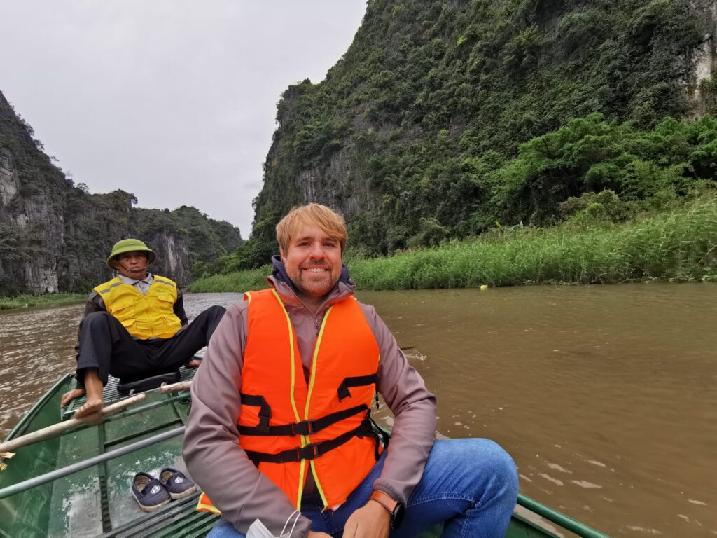 Am nächsten Tag ging es für uns mit einem Ruderboot weiter, um die „Tam Cốc“ (deutsch: Drei Höhlen) zu besichtigen. Hier wird man von einem Bootsführer entlang malerischer Landschaften geführt, umhüllt von Reisfeldern und Kalksteinfelsen. Unterwegs passiert man mit dem Boot drei Kalksteinhöhlen. Die Bootsführer haben hier zum Rudern eine ganze eigene Technik entwickelt. Es wird nämlich nur am Anfang ein kurzes Stück von Anlegestelle mit den Händen gerudert und anschließend mit den Füßen weitergemacht. Den ganzen Ruderablauf zu koordinieren und das Boot so durch die Flussarme zu manövrieren stellen wir uns nicht gerade einfach vor. Dies hatte bei den Bootsführern jedoch erstaunlich gut funktioniert.
