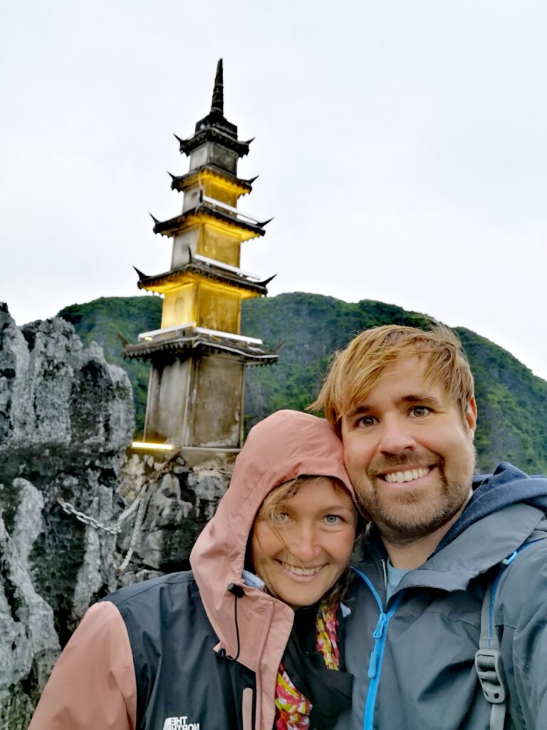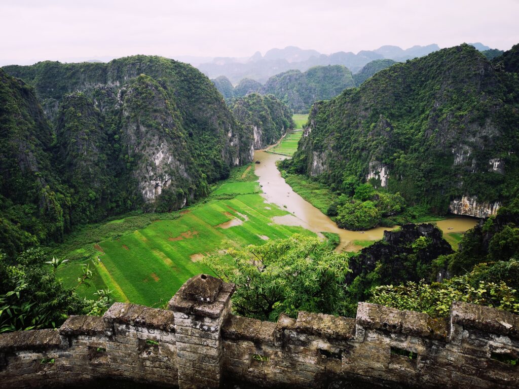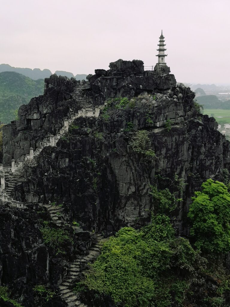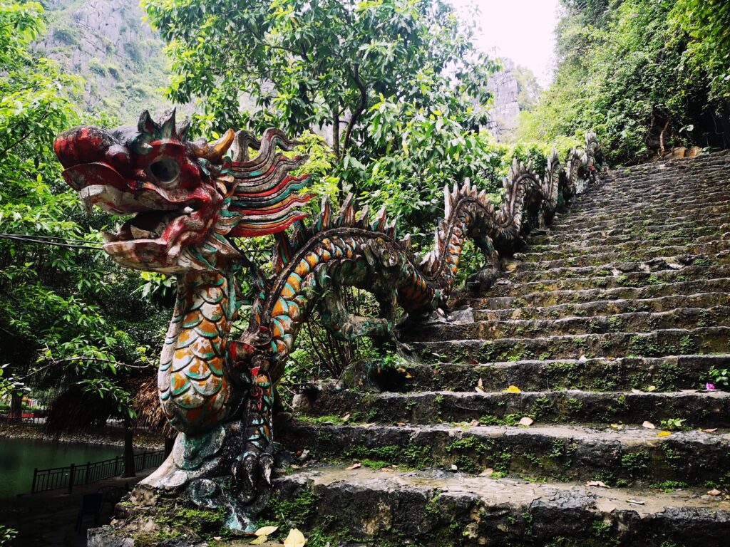 Nach der Halong Bay ging es für uns weiter in die Region „Ninh Bình“. Das Landschaftsbild dort ist ebenfalls von zahlreichen hohen Kalksteinfelsen geprägt. Deshalb wird Ninh Bình oftmals als trockene Halong-Bucht bezeichnet. Statt Wasser findet man dort zahlreiche Reisfelder zwischen den Kalksteinfelsen. Unser heutiges Ausflugsziel führte uns zu den Mua Caves. Auf deutsch bedeutet dies soviel wie „Tanzhöhle“, da hier früher zahlreiche Tanzaufführungen stattgefunden haben. Des Weiteren gibt es einen Aufstieg zu einem Aussichtspunkt, den man nach etwas mehr als 500 Stufen erreicht. Die Treppe wird von einem Drachen geziert und an deren Ende angekommen, hat man die Möglichkeit das Panorama auf die umliegenden Reisfelder zu genießen.