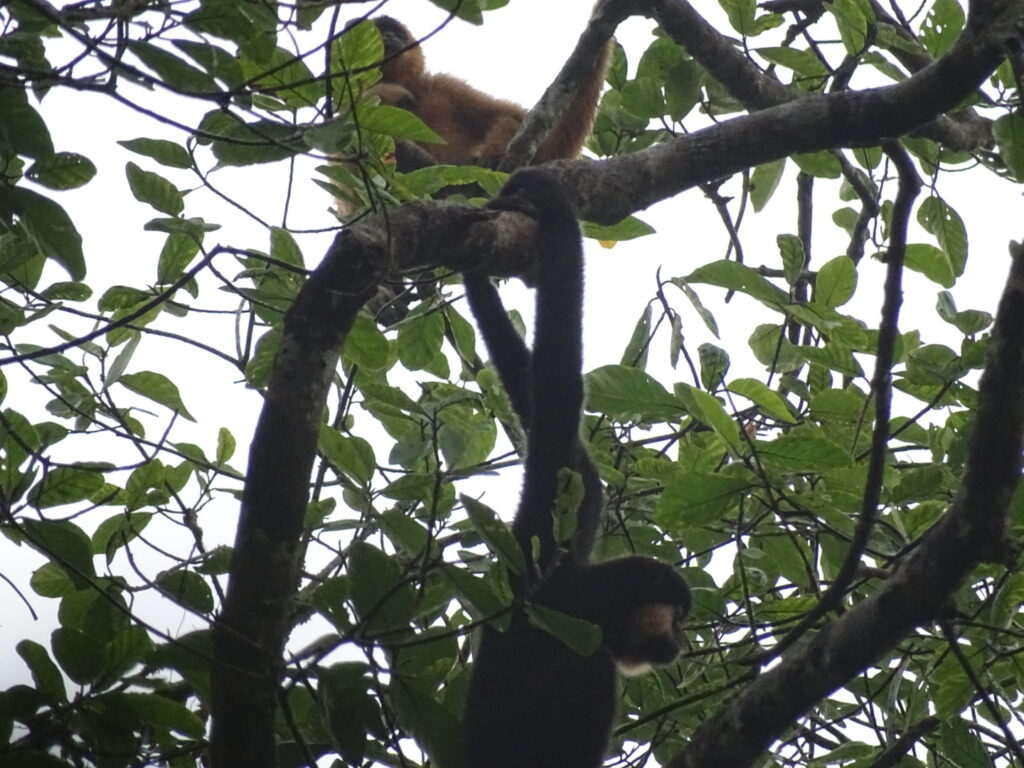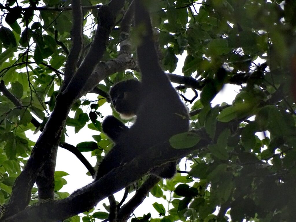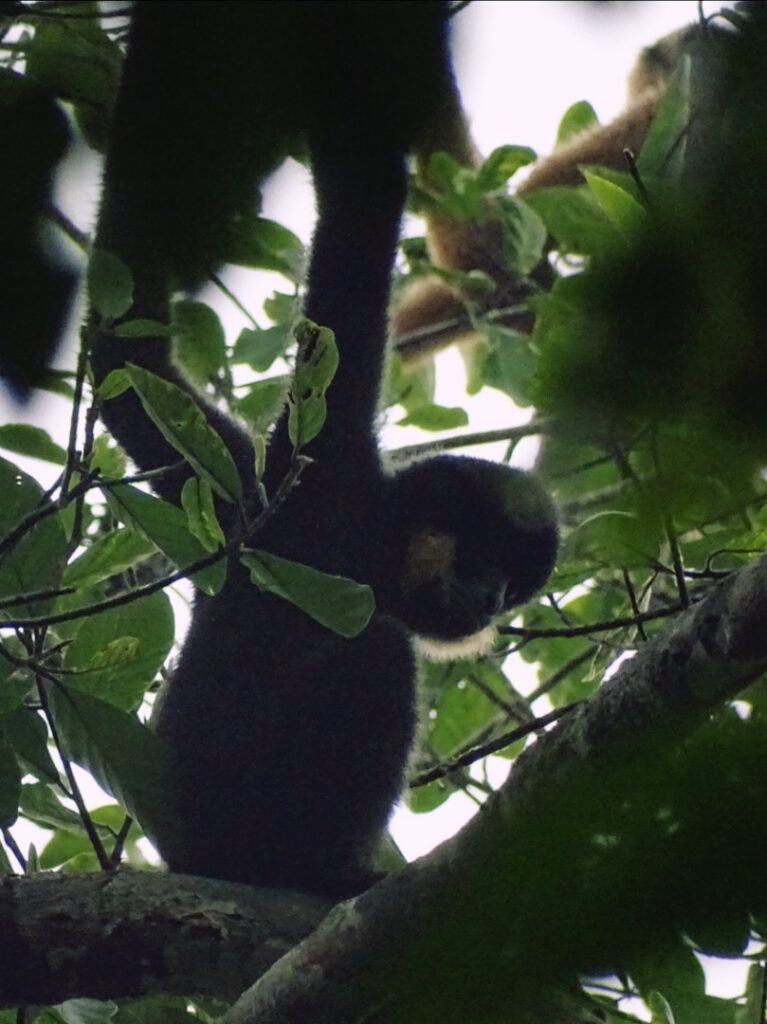 Mittlerweile konnten wir schon den Morgengesang der Gibbons hören und ab und zu ein Rascheln im Blattwerk über uns vernehmen. Allerdings war es sehr schwierig einen Blick auf einen Gibbon zu erhaschen, da sich diese sehr schnell in den Baumkronen von Ast zu Ast hangelten. Es war besonders beeindruckend zu sehen mit welcher Geschwindigkeit und welchem Geschick sich diese Tiere fortbewegten. Ihre langen Arme sind bei der Fortbewegung entscheidend, denn im Gegensatz zu anderen Affenarten besitzen Gibbons keinen Schwanz, der Ihnen dabei behilflich sein könnte. Letztendlich kamen wir an einem Baum, in der sich eine ganze Gibbonfamilie befand, die wir in Ruhe beobachten konnten. Es war faszinierend die Tier in freier Wildbahn zu beobachten und „singen“ zu hören, so dass wir dort eine ganz Weile verblieben, ehe unser Ranger uns noch zu einer zweiten Gibbonfamilie führte, die sich nur unweit entfernt in einem andern Baum aufhielt.