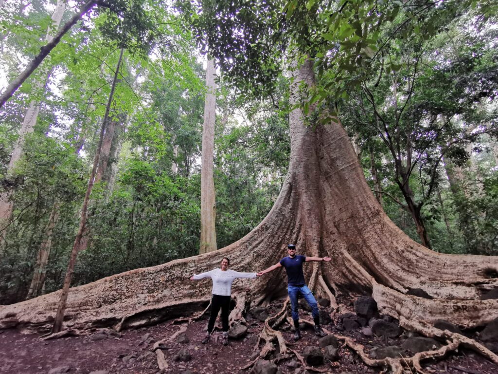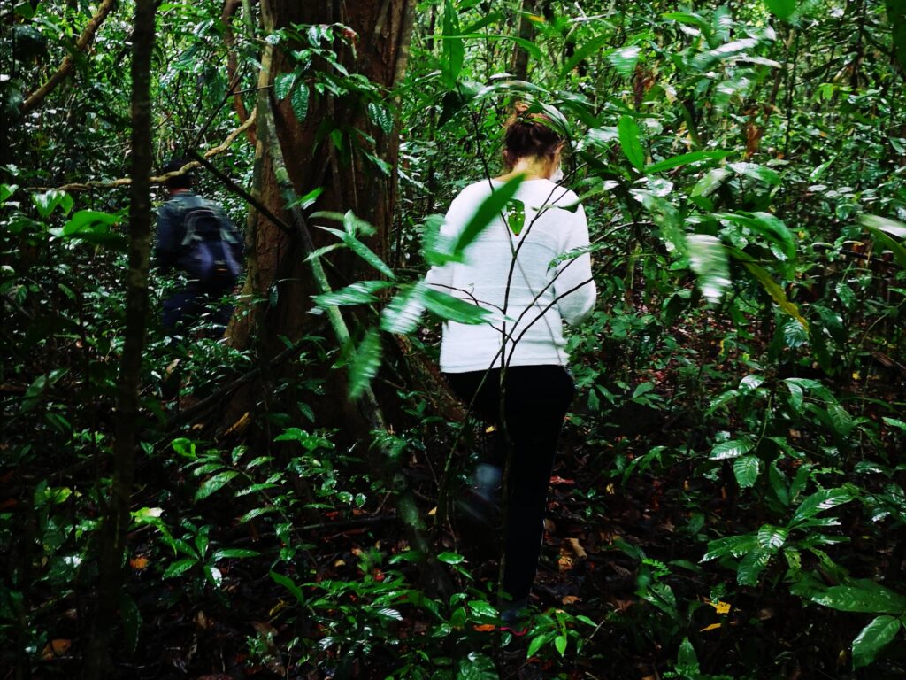 An einem großen Baum wurden wir angewiesen einen Moment zu warten, während unser Ranger versuchte die Gibbons ausfindig zu machen. Alleine in der Dämmerung warteten wir eine ganze Weile und fragten uns schon, ob wir den Weg zurück wieder alleine finden würde, falls unser Ranger nicht mehr auftauchen würde. Doch nach knapp 20 Minuten tauchte er wieder auf und wies uns eine Richtung, in der wir ihm folgen sollten. Nun zog das Schritttempo merklich an und wir verließen auch den eingetretenen Trampelpfad und rückten immer näher in den tiefen Dschungel vor. Spätestens jetzt waren wir uns sicher, dass wir wohl Schwierigkeiten hätten den Weg wieder zurück zu finden. Kurzzeitig verloren wir unseren Ranger aus den Augen, als wir versuchten ihm durch das Dickicht des Dschungels zu folgen und dabei Schritt zu halten. Nach einem kurzen Anflug von Panik, hörten wir ihn jedoch bereits nach uns rufen und fanden ihn rasch wieder. Er wies uns noch einmal kurz an stehen zu bleiben und zeigte auf unsere Beine. Dort waren kleine Würmer, die sich auf unseren Schuhen und entlang der Hosenbeine windeten. Diese Würmer entpuppten sich als Blutegel, wovon einer gerade dabei war sich an Ronja’s Bein festzusaugen. Geschickt entfernte unser Guide den Blutegel und wies uns an die Hosenbeine in unsere Socken zu stecken. Außerdem wurden unsere Schuhe mit einer Paste eigerieben, welche die Tierchen fernhalten sollten, ehe es weiter einwärts in den Dschungel ging.