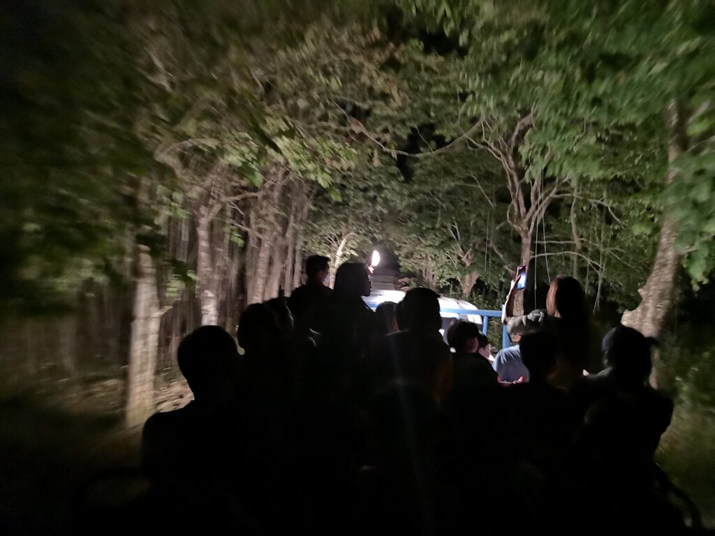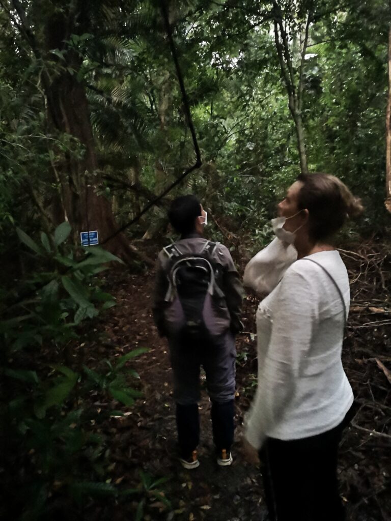 Generell waren noch nicht viele Besucher in der Gegend, so kurz nachdem das Land seine Grenzen wieder geöffnet hatte. Auch in unserem Hotel waren wir, neben einem anderen Pärchen, die einzigen Gäste. So waren wir auch in dieser Nacht die einzigen beiden Besucher mit unserem Ranger auf dem Wild Gibbon Trek. Zunächst ging es mit unserem Guide entlang eingetretener Pfade in den Dschungel hinein. Unterwegs bekamen wir unter anderem eine Spinne sowie einen Leuchtkäfer zu sehen.