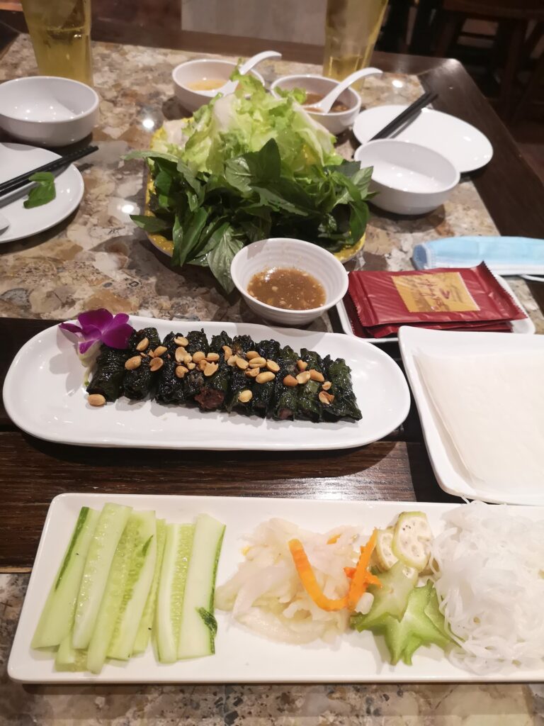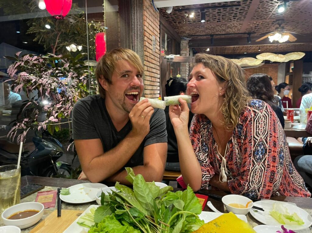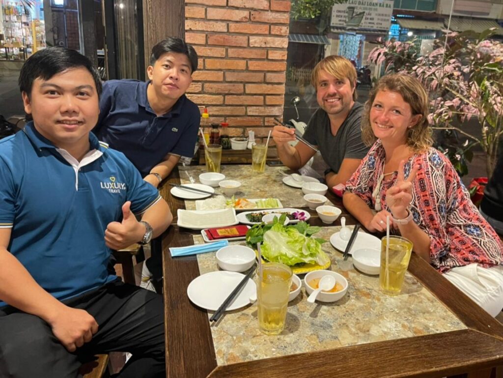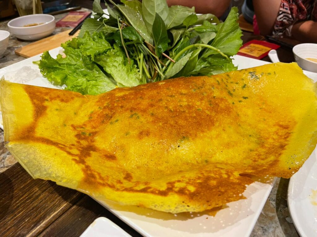 Nach der Vorspeise ging es auf dem Roller weiter zu einem Restaurant, wo man einen riesigen, deftigen Pannenkuchen (Banh Xeo) und weitere südvietnamesische Speisen serviert bekamen. Einige davon sollten wir nach der Anleitung unsere Guides selbst belegen und zu einer Rollen formen. Das hat wirklich Spaß gemacht und auch für reichlich Gesprächsstoff mit unseren Guides gesorgt, die uns jede Menge interessante Informationen über die ihre Stadt und das Essen hier zu erzählen hatten. Unter den Gewürzen und Kräutern die man beim Belegen seiner Rolle nutzen konnte, gab es auch ein sogenannte „Fischblätter“. Diese schmecken tatsächlich sehr fischig, waren aber nicht so ganz unser Fall.