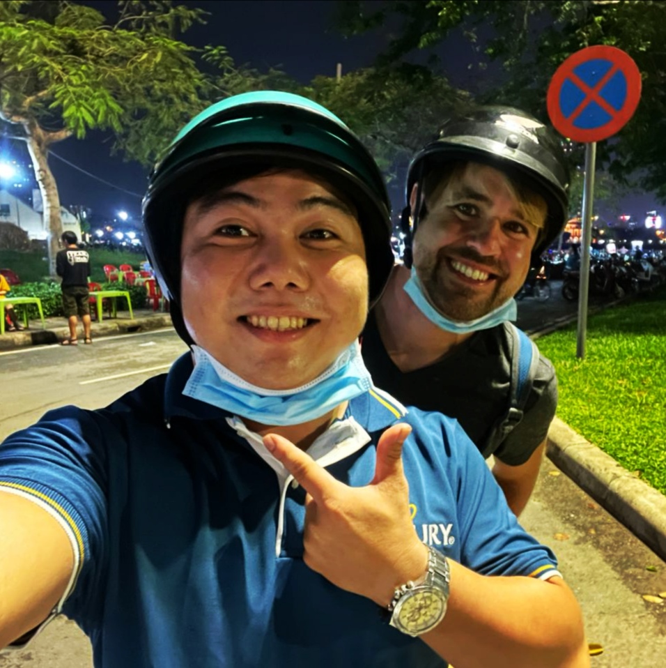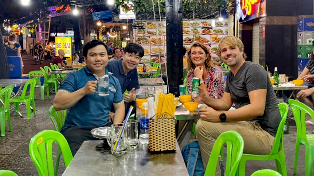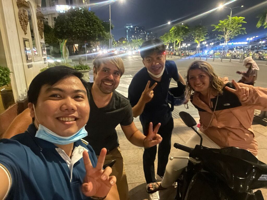 Nun waren wir bereits gut gesättigt und es ging weiter zu einem kurzem Stopp an einem Flussufer, von wo aus man einen fantastischen Ausblick auf die beleuchteten Wolkenkratzer entlang des „Bach Dang Pier“ bei Nacht hatte. Dies war auch ein sehr beliebter Ort bei den Einheimischen, die sich hier zu einem Feierabendbier trafen oder ihr Abendessen an einem Straßenimbiss zu sich nahmen. Ein kleiner Imbiss auf Rädern, der recht beliebt zu sein schien weckte unsere Neugier. Unser Guide erklärte uns, dass es sich um eine gerollte vietnamesische Süßspeise handelt. Er bestellte zwei Stück und spendierte uns jeweils eine dieser süßen Röllchen.