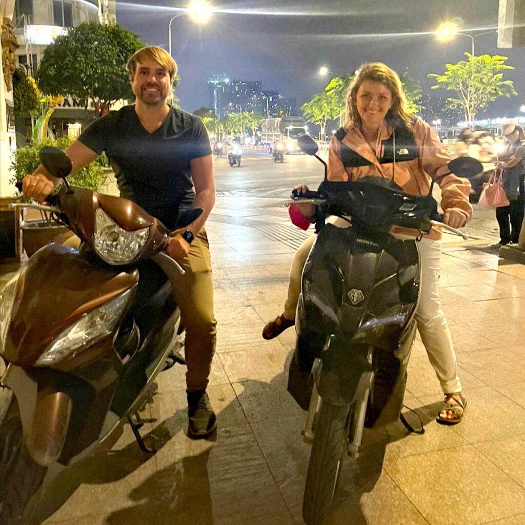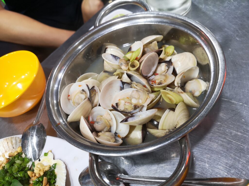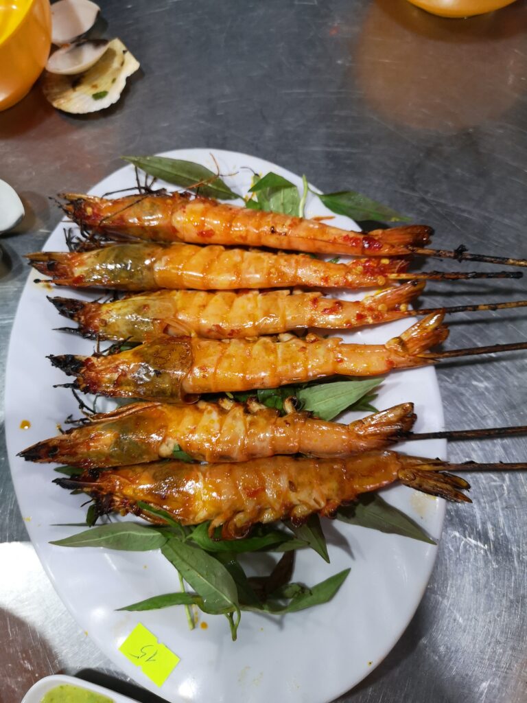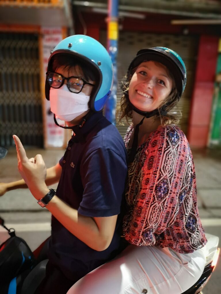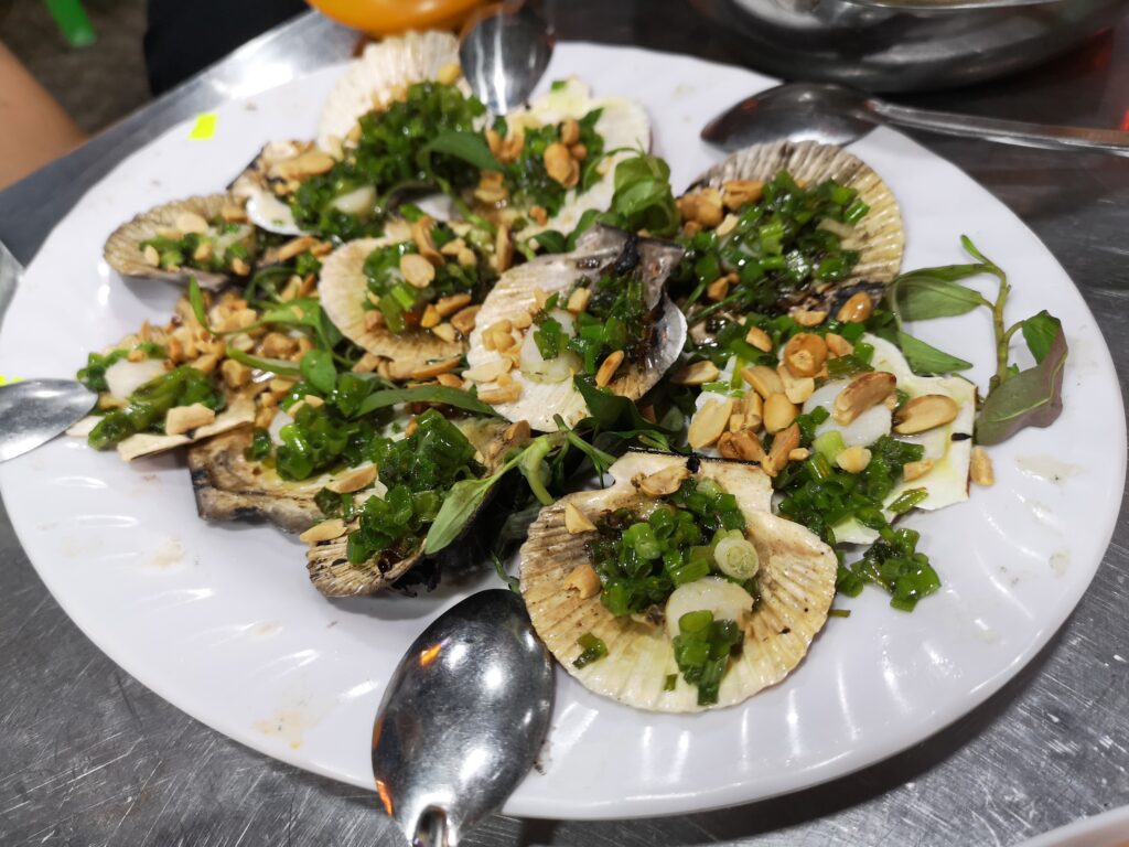 Am Abend haben wir an einer Street-Food-Scooter-Tour teilgenommen. Pünktlich zum Feierabendverkehr wurden wir von unsern beiden Guides mit dem Roller abgeholt. Zu dem Zeitpunkt ist der meiste Verkehr und es wirkt alles sehr chaotisch, scheint aber dennoch eine gewisse Struktur zu besitzen, auch wenn diese für uns Europäer eher nicht ersichtlich war. Wir schlängelten uns kreuz und quer durch enge Gassen und über völlig überfüllte Kreuzungen. Vorbei an aneinander gedrängten Fußgängern, Rollern, Rädern und Autos, die immer wieder einmal hupten und versuchten irgendjemandem auszuweichen oder Platz zu machen. Es war wirklich faszinierend, dass das alles doch irgendwie funktioniert. Dennoch waren wir äußerst froh, dass wir heute nur Mitfahrer waren. Außerdem gab es, die ein oder andere Situation, in der sich Ronja bei ihrem Fahrer besonders festgekrallt hatte. Der erste Stopp unsere Street-Food-Tour war an einem lokalem Fischladen, wo wir Garnelen, gedämpfte Muscheln mit Zitronengras und gegrillte Muscheln mit Schalotten serviert bekamen.