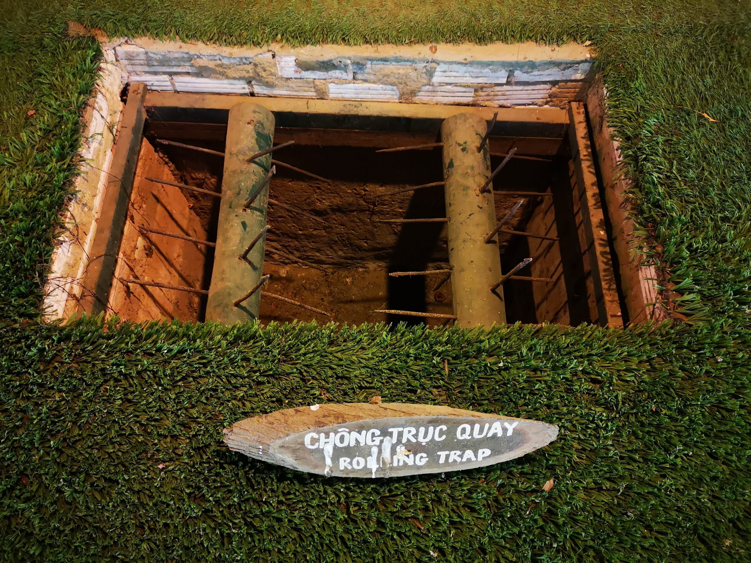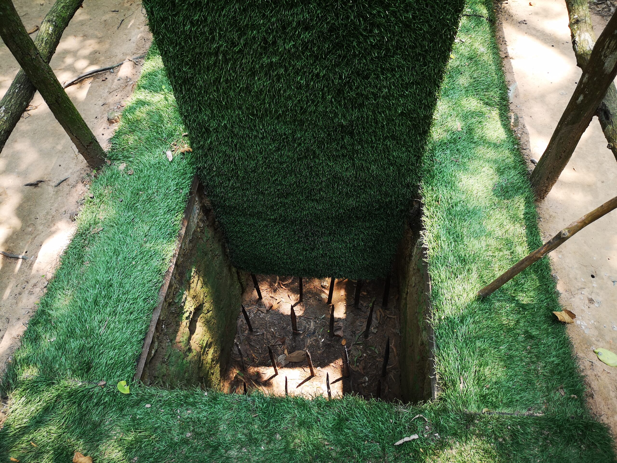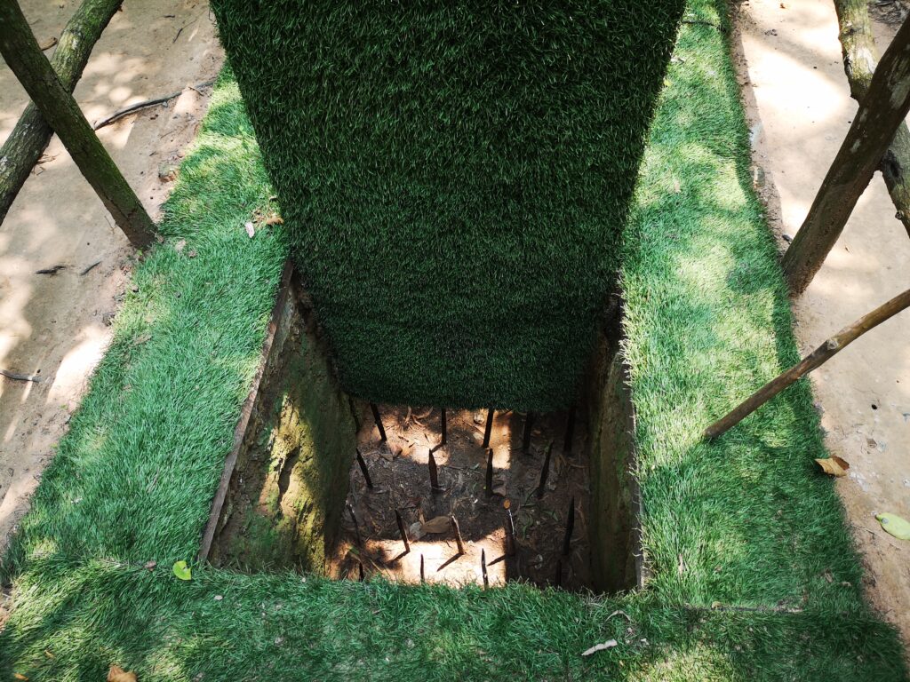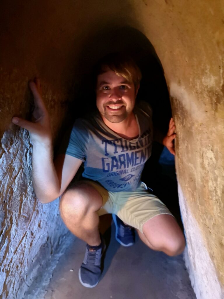 Das Tunnelsystem umfasste Küchen, Waffenlager, Krankenstationen und Schlafbereiche sowie Luftschutzbunker, um sich vor Bombenangriffen zu schützen. Die Tunnel waren oft eng und dunkel und boten nur begrenzte Belüftung, was zu Atembeschwerden und anderen Gesundheitsproblemen führte. Außerdem waren sie auch feucht und kalt und boten nur begrenzte Möglichkeiten, sich zu waschen oder zu entspannen. Um sich hautnah ein Bild davon machen zu können, gab es auch die Option einen Teil des Tunnels selbst zu begehen. Dieser Abschnitt war bereits für Touristen verbreitert worden. Jedoch hatte sich selbst dieser kurze Gang sehr beengt und unbehaglich angefühlt. Kaum auszumalen, wie es sein musste dort tatsächlich mehrere Jahre gelebt zu haben. Andere Tunneleingänge waren sehr gut im Boden versteckt. Als mein Guide sagt ich könne gerne mal in solch einen Eingang hineinsteigen, war mein erster Gedanke, dass ich dort ja überhaupt nicht reinpasse. Mit der richtigen Technik – nach oben gestreckte Arme, statt breitschultrig – hatte es jedoch funktioniert.