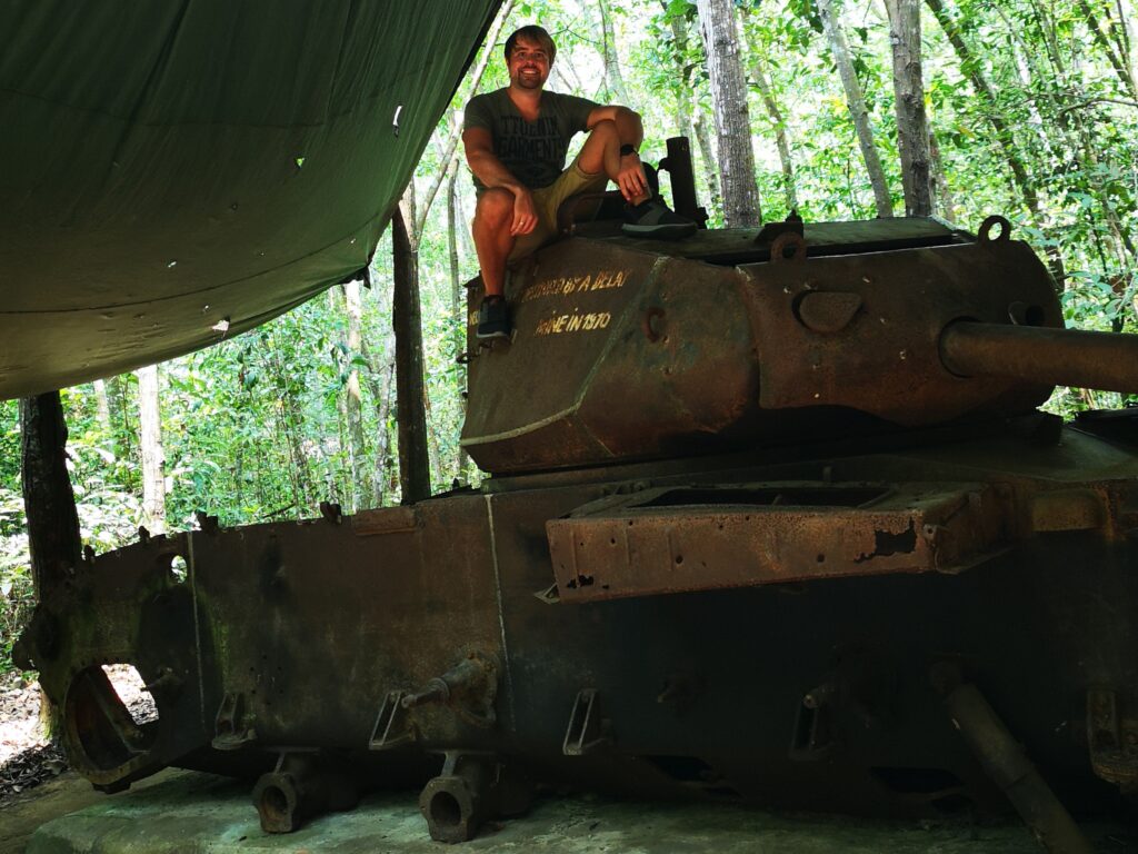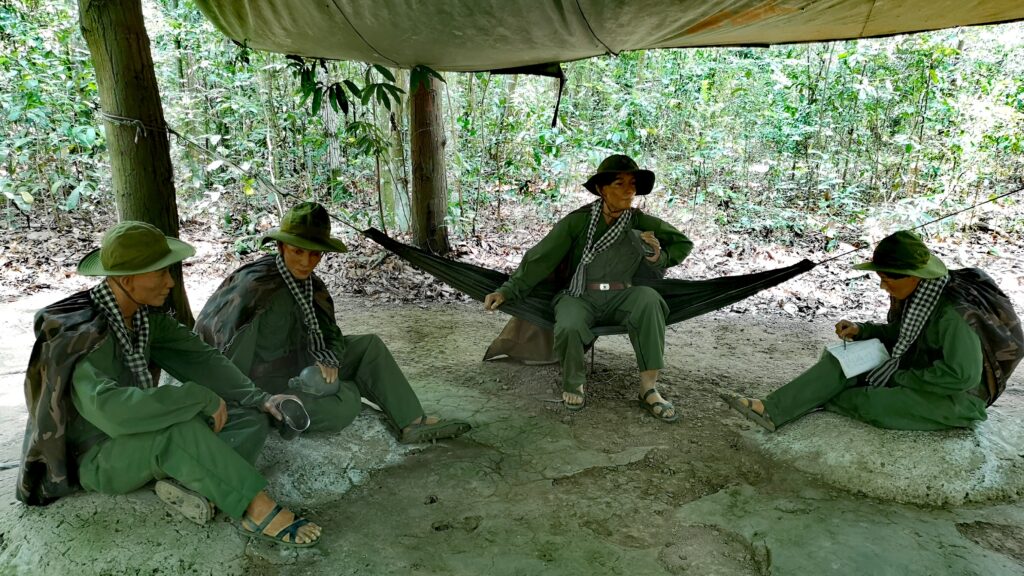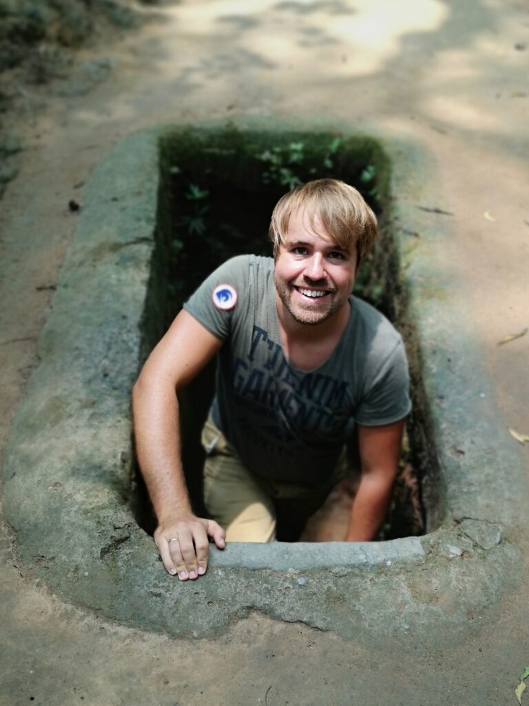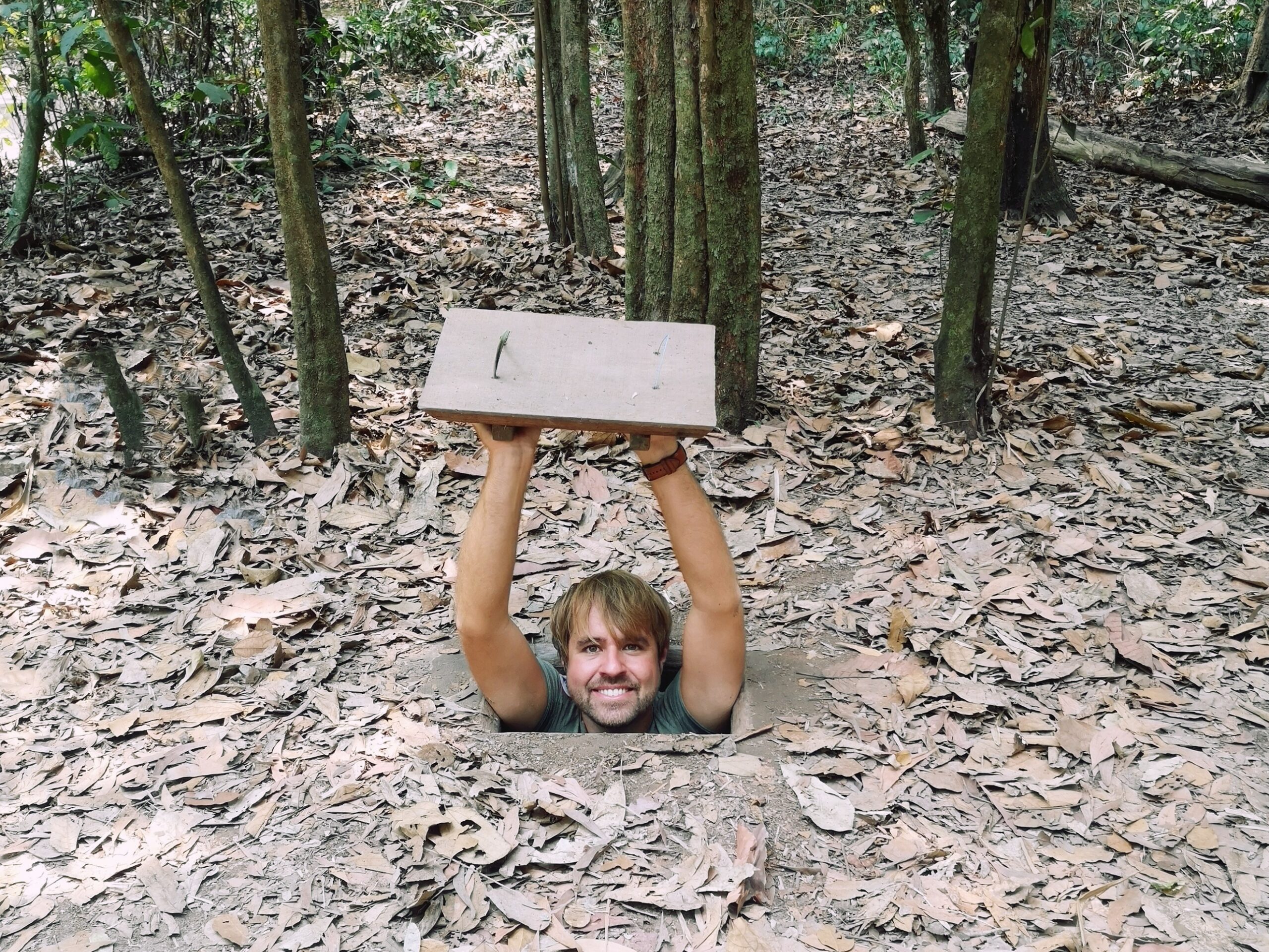 Das Tunnelsystem umfasste Küchen, Waffenlager, Krankenstationen und Schlafbereiche sowie Luftschutzbunker, um sich vor Bombenangriffen zu schützen. Die Tunnel waren oft eng und dunkel und boten nur begrenzte Belüftung, was zu Atembeschwerden und anderen Gesundheitsproblemen führte. Außerdem waren sie auch feucht und kalt und boten nur begrenzte Möglichkeiten, sich zu waschen oder zu entspannen. Um sich hautnah ein Bild davon machen zu können, gab es auch die Option einen Teil des Tunnels selbst zu begehen. Dieser Abschnitt war bereits für Touristen verbreitert worden. Jedoch hatte sich selbst dieser kurze Gang sehr beengt und unbehaglich angefühlt. Kaum auszumalen, wie es sein musste dort tatsächlich mehrere Jahre gelebt zu haben. Andere Tunneleingänge waren sehr gut im Boden versteckt. Als mein Guide sagt ich könne gerne mal in solch einen Eingang hineinsteigen, war mein erster Gedanke, dass ich dort ja überhaupt nicht reinpasse. Mit der richtigen Technik – nach oben gestreckte Arme, statt breitschultrig – hatte es jedoch funktioniert.