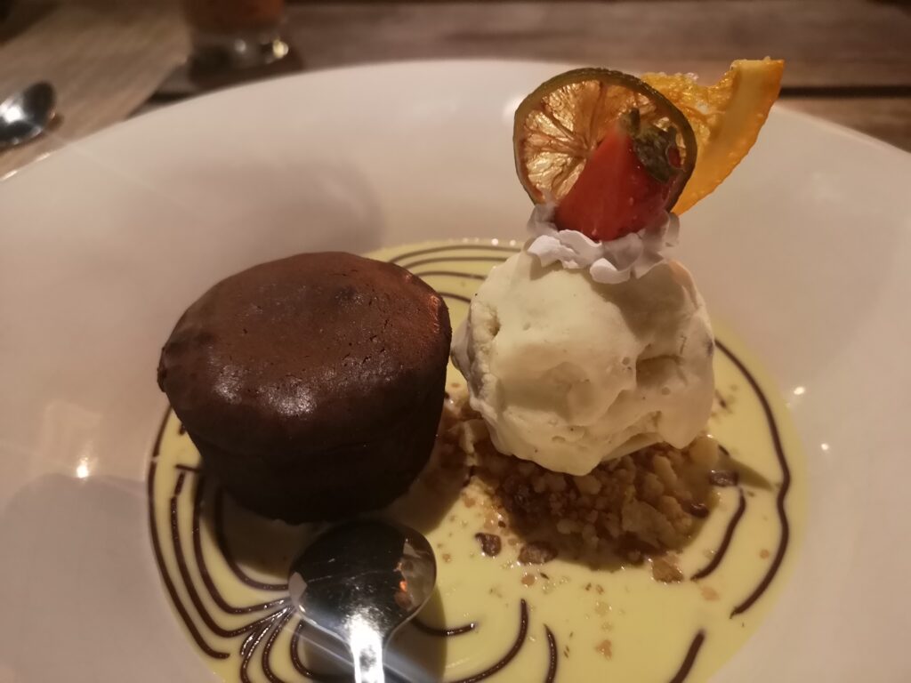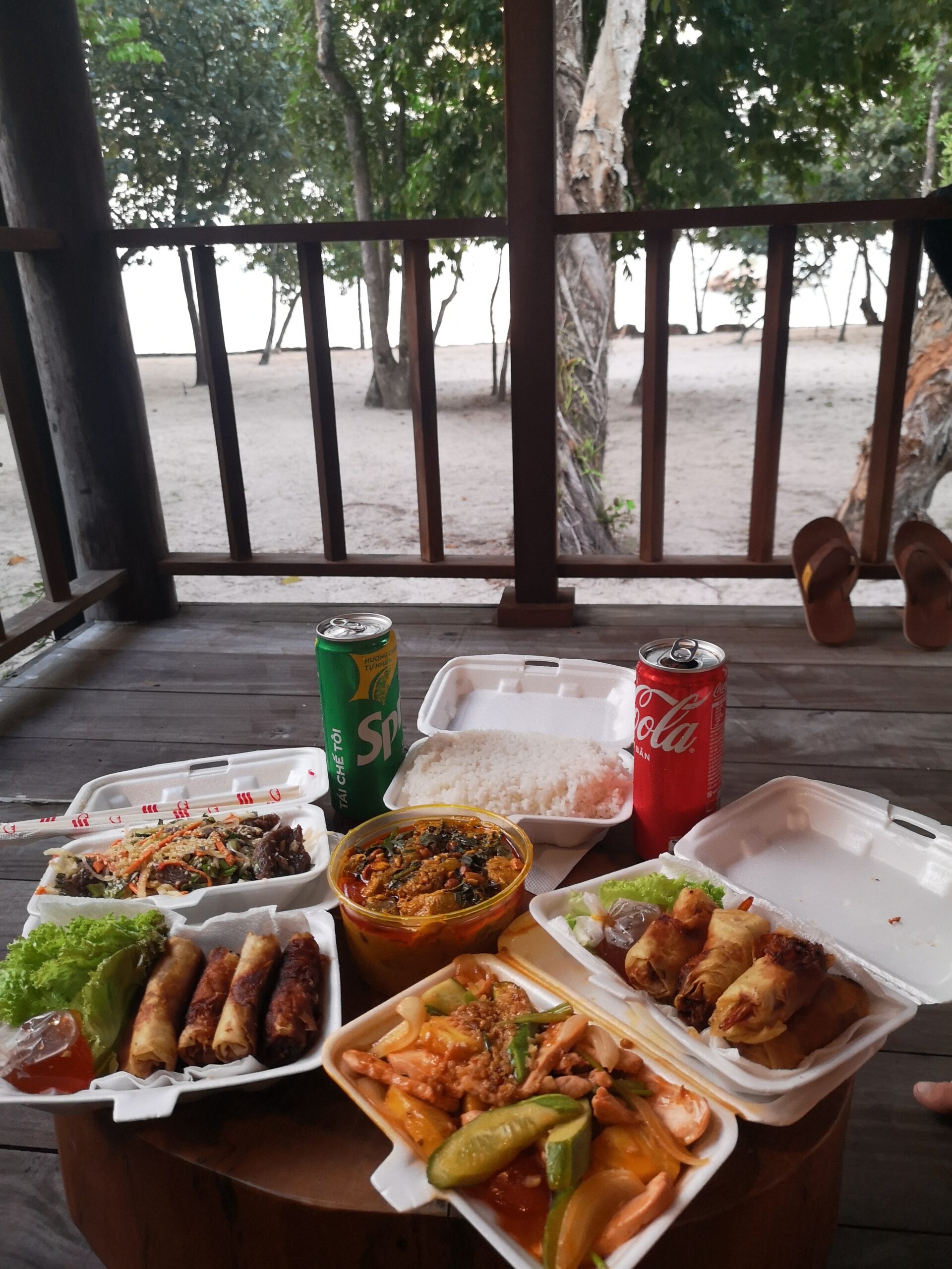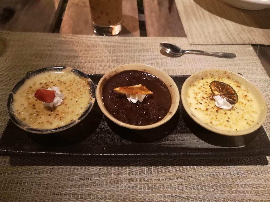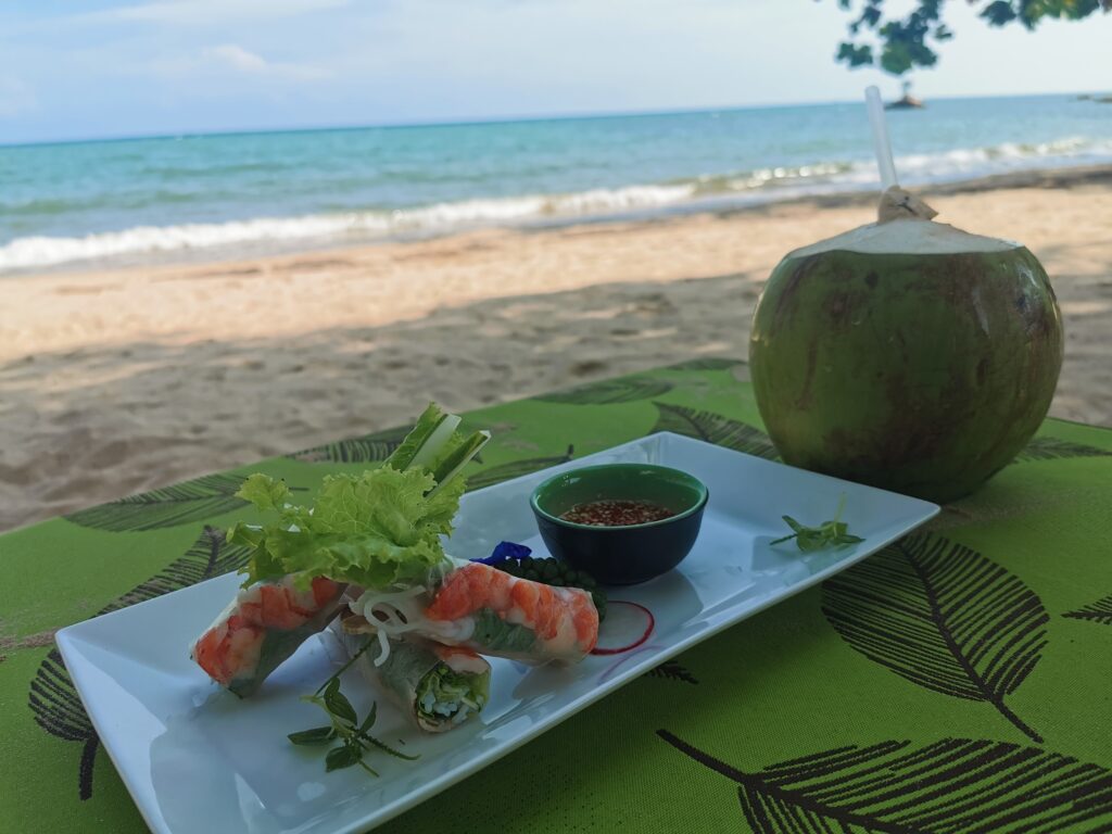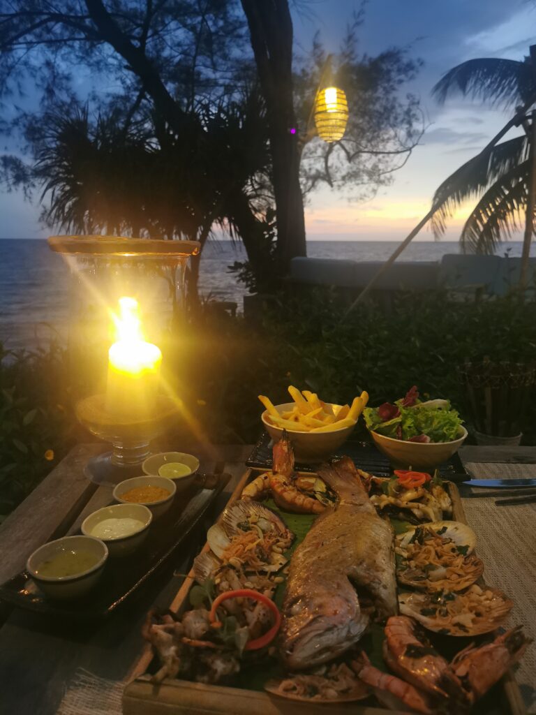 Gegen Abend statteten wir dem Mango Bay Resort einen Besuch ab. Das Resort betreibt zwei Restaurants, das „On the Rock“ und „On the Sand“. In letzterem stehen die Tische buchstäblich auf dem Sandstrand, und die Gäste können ihre Mahlzeiten mit den Füßen im Sand genießen. Während dem Abendessens kann man Sonnenuntergang über dem Meer beobachten, was dem Abend eine romantische Atmosphäre verleiht. Es ist daher sehr empfehlenswert, einen Tisch für den Sonnenuntergang zu reservieren. Serviert wird traditionelle vietnamesische Küche und Meeresfrüchte. Vor dem Restaurantbesuch bietet es sich an einen kleinen Standsparziergang zu unternehmen.