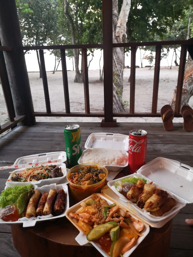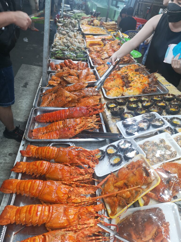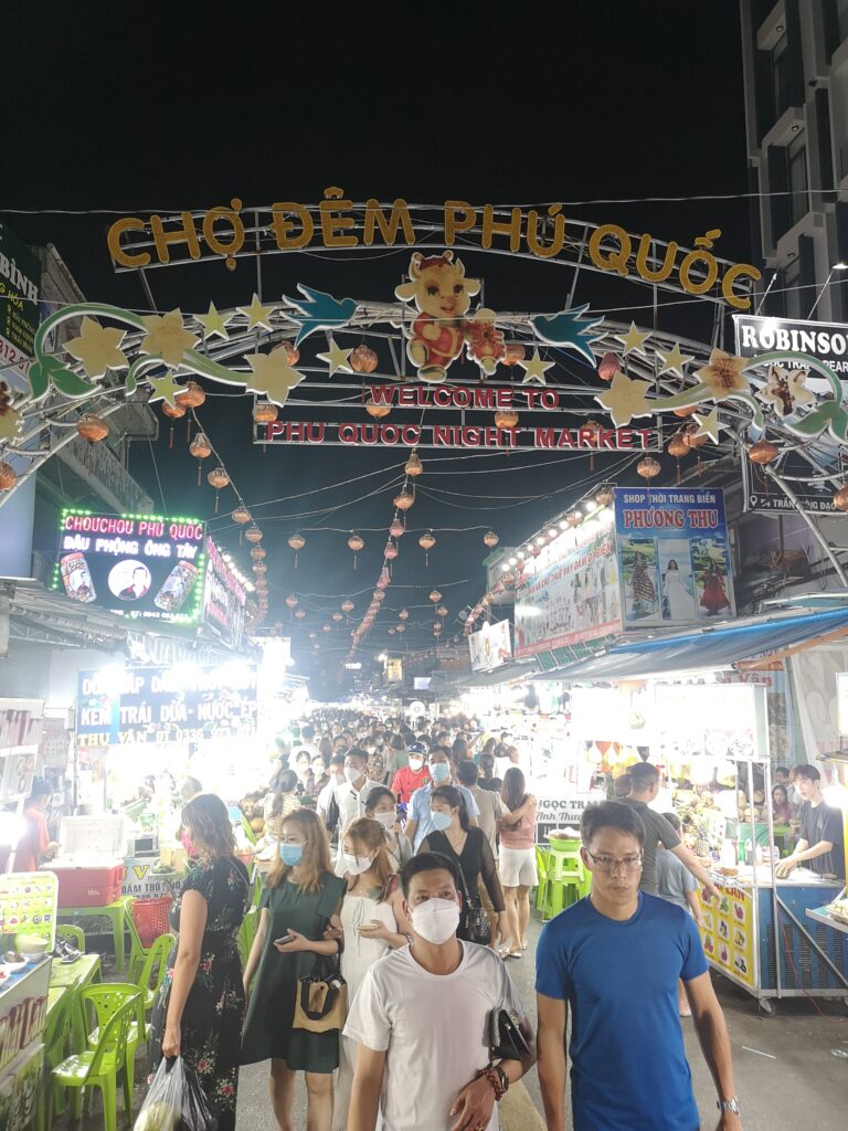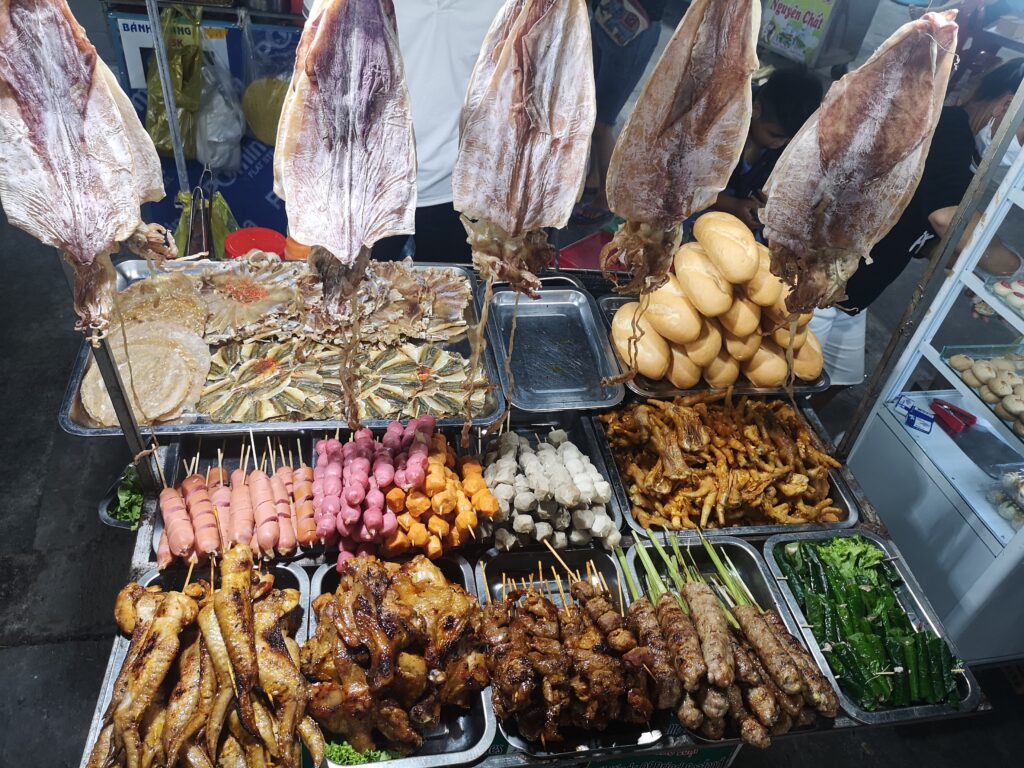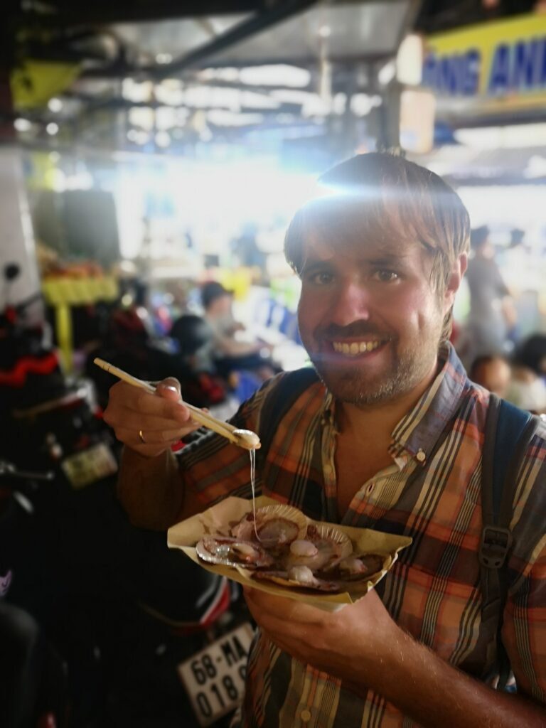Am nächsten Tag besuchten wir den größten und bekanntesten Nachtmarkt in Phú Quốc. Dort haben wir auf den typischen kleinen Plastikstühlen der verschiedenen Essensstände Platz genommen und uns durch vietnamesisches Streetfood und exotische Früchte probiert. Besonders beliebt in Phú Quốc sind Meeresfrüchte und Jakobsmuscheln. Obwohl ich hier etwas probierfreudiger war als Ronja, wurde auch sie fündig. Ihr Favorit waren gegrillte Okraschoten mit einer besonders leckeren Marinade.