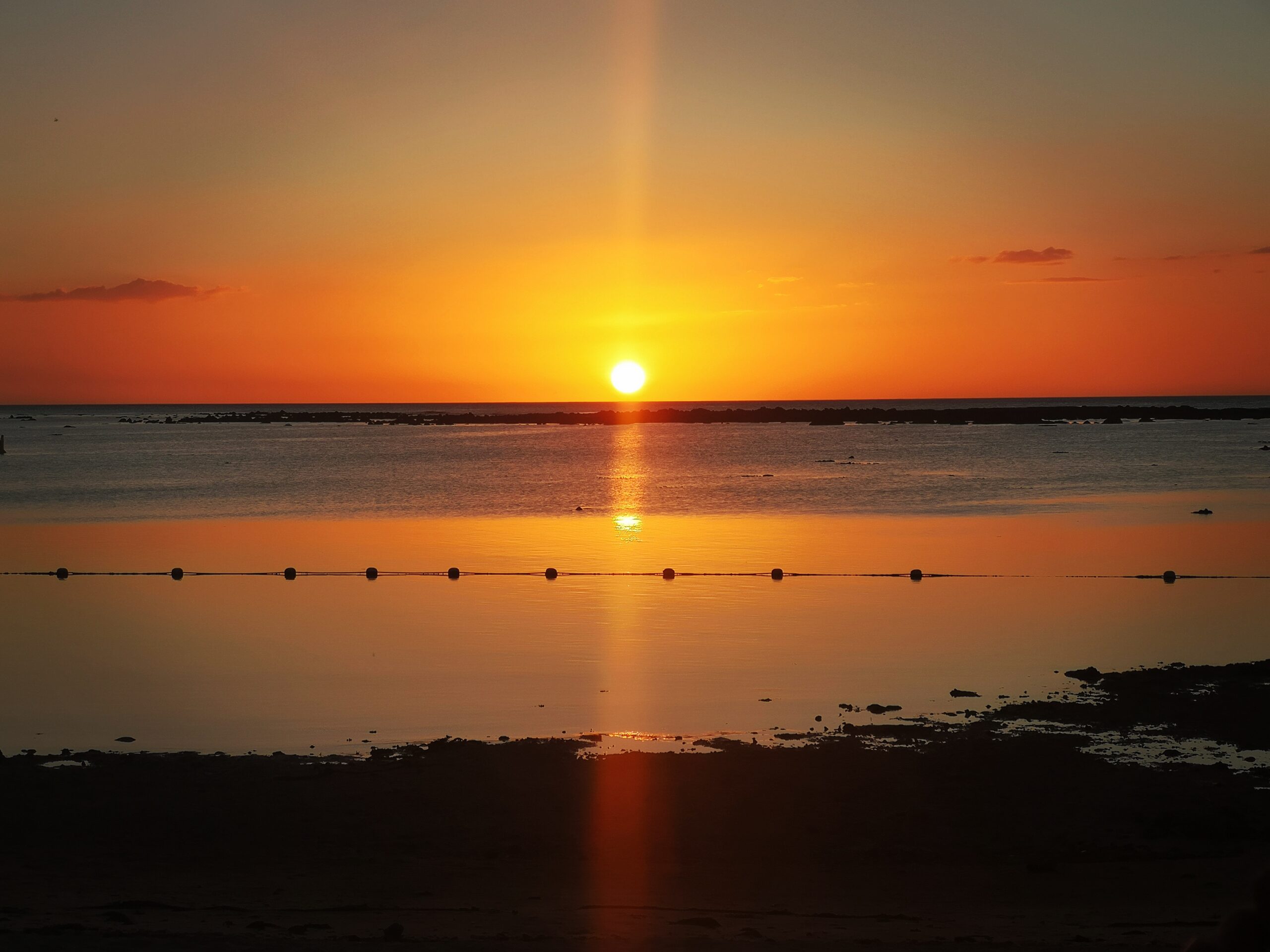 Den restlichen Tag verbrachten wir am Strand in der Bucht und genossen dort den Ausblick, die Sonne und das erfrischende Wasser. Gegen 17 Uhr machten wir uns auf den Rückweg, um pünktlich zum Sonnenuntergang wieder auf dem westlichen Teil der Insel zu sein. Und tatsächlich wurden wir hier zum ersten Mal mit einem völlig wolkenfreiem Sonnenuntergang am Meereshorizont belohnt.