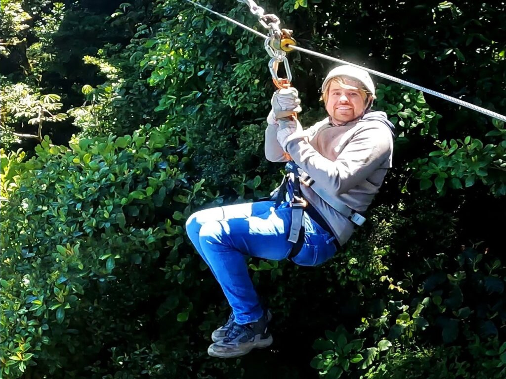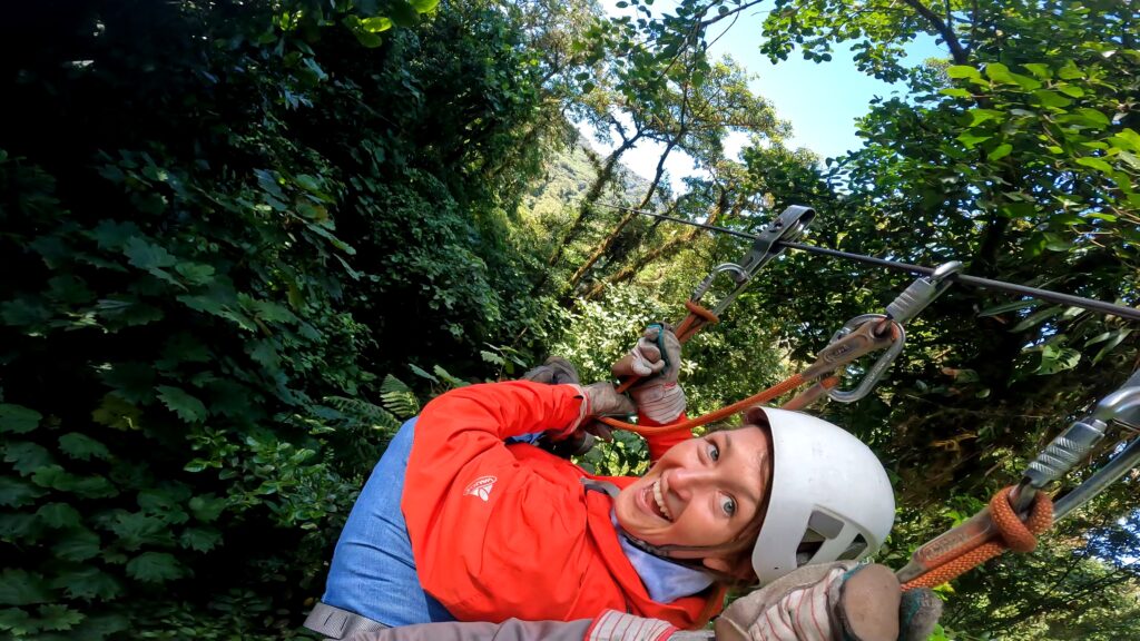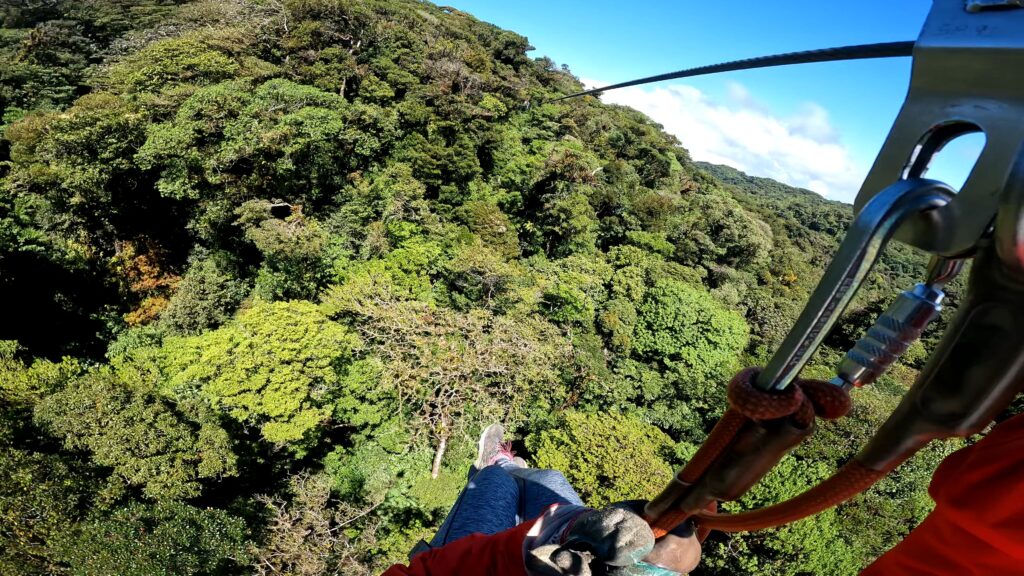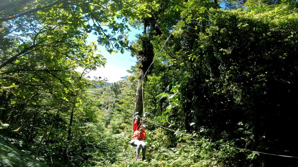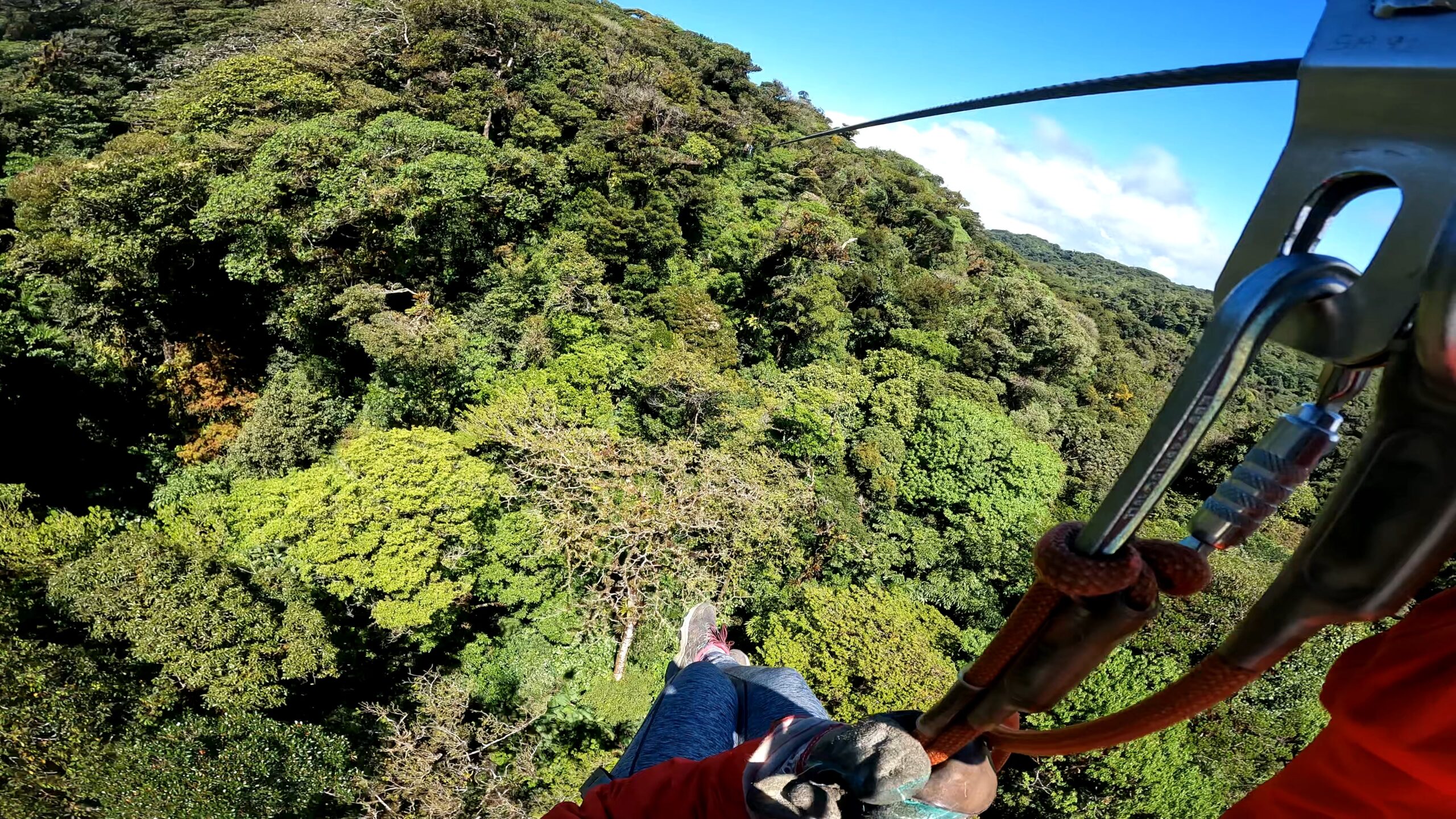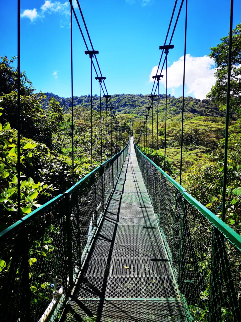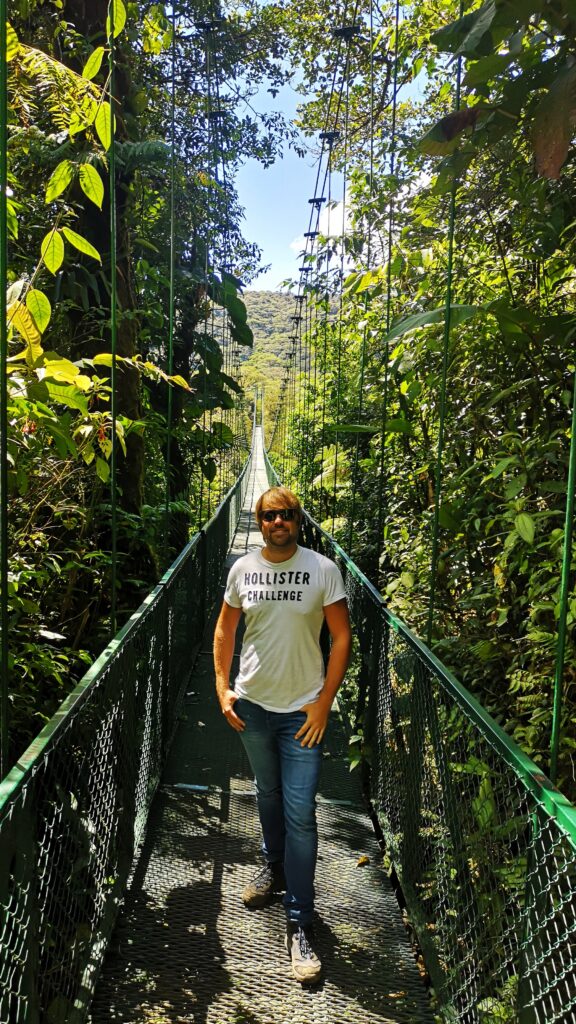 Ein saftiger grüner Regenwald mit hochgewachsenen Farnen, Lianen und vermoosten Bäumen, die in einem leichten Nebeldunst hängen. Zudem kleine rauschende Bäche, die mittels baumkronen hoher Hängebrücken überquerbar sind. Dafür ist der Nebelwald von Monteverde bekannt und das wollten wir uns auf keinen Fall entgehen lassen. Hier gibt es einige Wanderwege und Anbieter die diese Erfahrung versprechen. Mit am bekanntesten dürfte wohl das Reservat „Bosque Nuboso Monteverde“ sein, welches tolle Wanderungmöglichkeiten bieten soll. Wir entscheiden uns jedoch, das Erlebnis in Kombination mit einer Canopy-Tour (Ziplining) aufzupeppen. Auch hier gibt es verschieden Anbieter und wir entscheiden uns für den „Selvatura Park“, da sich dieser komplett durch den ursprünglichen Primärwalt von Monteverde schlängelt. Gestartet sind wir mit dem Ziplining, welches das Abseilen an insgesamt 13 Gleitseilen mit einer Gesamtlänge von über 3km beinhaltet. Die längste Teilstecke führt entlang eines 1 km langen Seils, bei einer Höhe von bis zu 180m. Das macht wirklich richtig Spaß und bietet außerdem ein phänomenales Panorama, dass sich vor einem Auftut, wenn man hoch über den Baumkronen des Regenwaldes hinweggleitet. An den beiden längsten Teilabschnitte wird man zu Zweit zusammengebunden, da man nur gemeinsam genügend Schwung erhält, um nicht auf halber Strecke stehen zu bleiben und von einem Guide herübergezogen werden zu müssen. Das gemeinsame hinweggleitet hatte uns besonders viel Spaß gemacht. Gegen einen kleinen Aufpreis hätte man eine Teilstrecke übrigens auch liegend in der Superman-Pose absolvieren können.